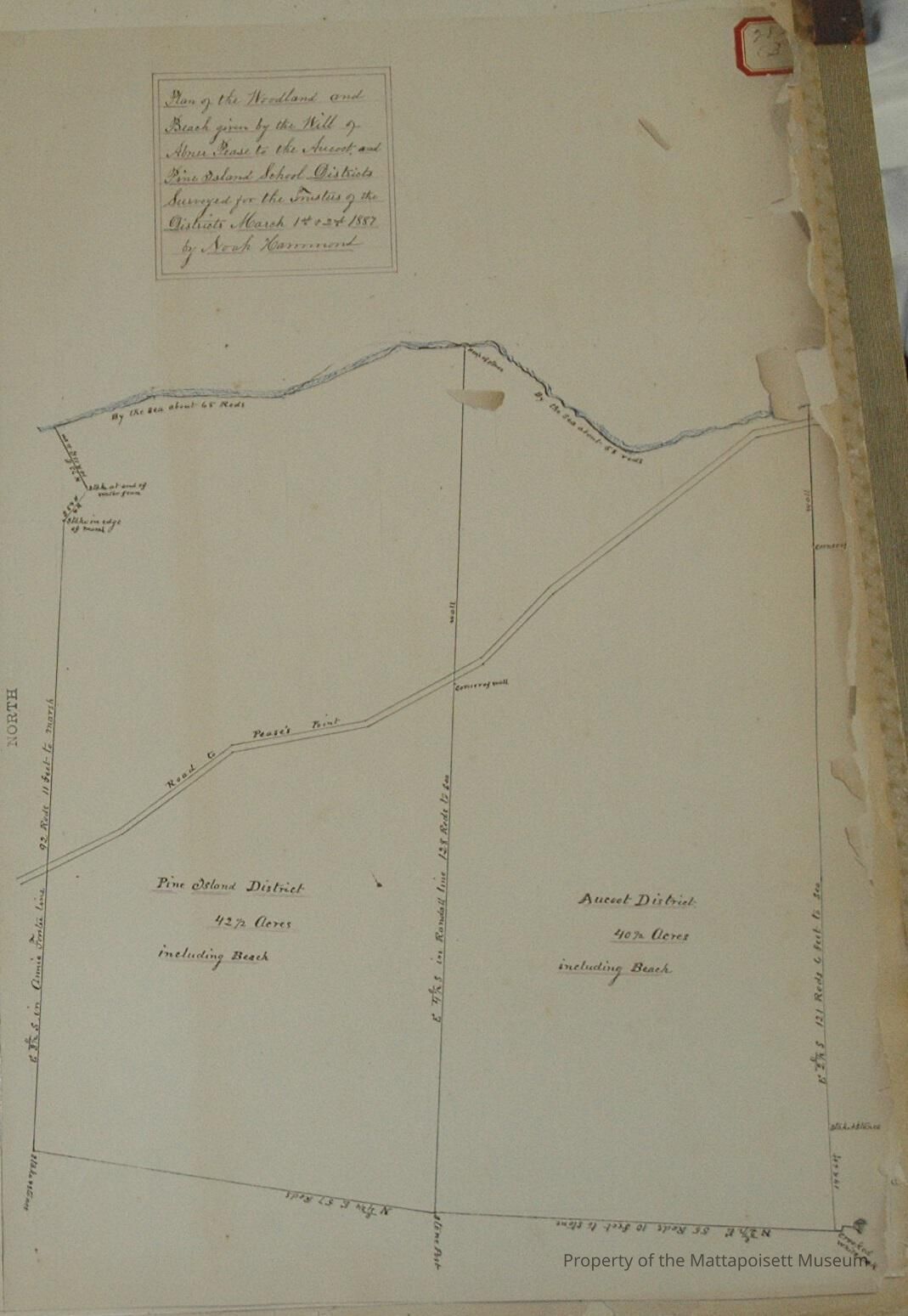 Plan of the woodland and beach given by the will of Abner Pease to the Aucoot and Pine Island School Districts. Surveyed for the Trustees of the Districts March 1st 1887 by Noah Hammond. Road to Pease's Point runs through. Pine Island District 42 ½ acres, including beach. Aucoot District 40 ½ acres, including beach. Annie Forster and Randall, abutting.Acquisition