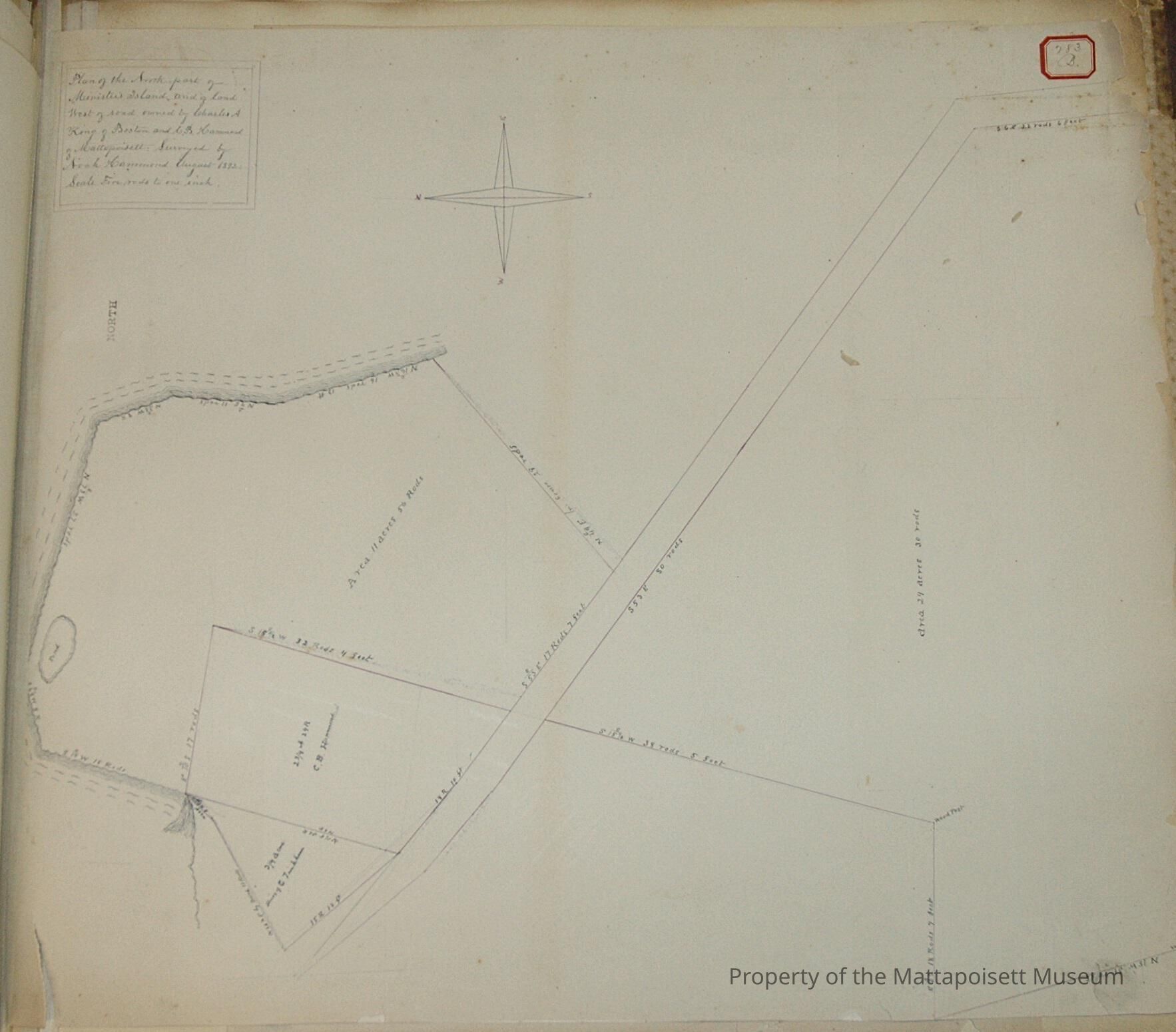 Plan of the north part of Minister's Island and of land west of road owned by Charles A. King of Boston and C. B. Hammond of Mattapoisett. Surveyed by Noah Hammond August 1832. Scale five rods to the inch. Heirs of C. J. Tinkham ¾ acres, C. B. Hammond 2 ¾ acres and 27 rods, division area 11 acres and 56 (northwest of road) rods and 29 acres and 30 rods (southeast of road).Acquisition
