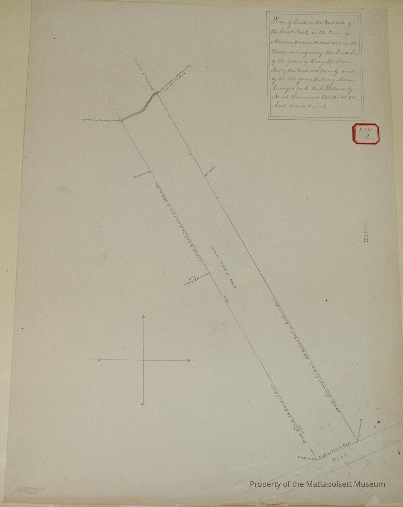 Plan of land on the west side of Great Neck, in the town of Marion, and on the east side of the Harbor and adjoining the south line of the farm of Henry D. Allen. Part of this land was formerly owned by the late James Delano of Marion. Surveyed for C. H. L. Delano by Noah Hammond October 9th and 10th 1890. Scale 10 rods to the inch. Area 19 acres and 70 rods. On the road.Acquisition