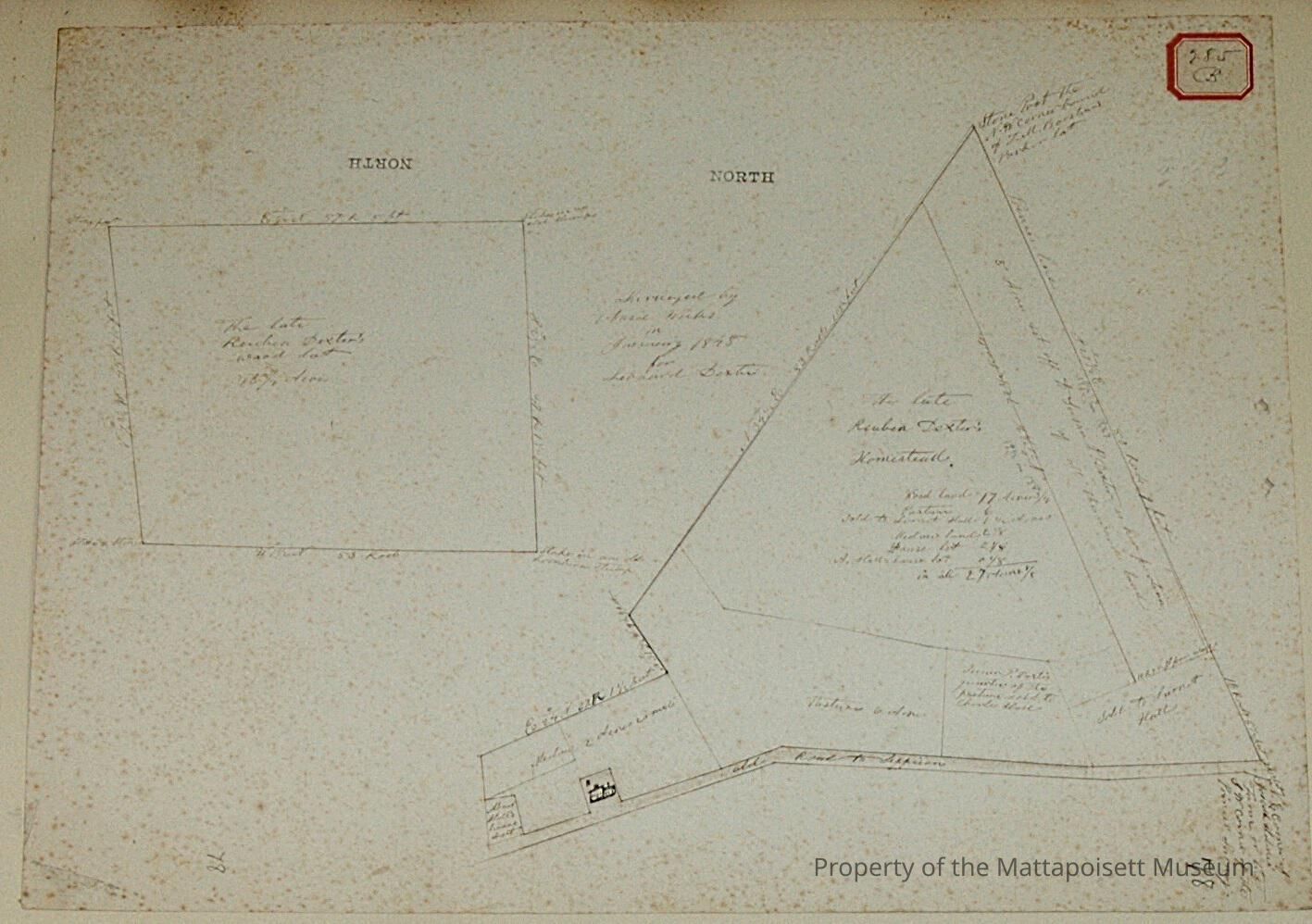 Surveyed by Ansel Weeks January 1848 for Leonard Dexter. The late Rueben Dexter's wood lot (15 ¾ acres). Abner Hall's house lot, 2 acre and 20 rods lot, 6 acre pasture lot, the late Reuben Dexter's Homestead (woodland at 17 acres ¾ , pasture 6 acres, sold to Larnet Hall 1 ½ acres, meadow 2 1/8 acres, house 1/8 acres, Abner Hall's 1/8 acre. In all 27 5/8 acres). Part sold to Larnet Hall. Five acres set off to Susan P. Dexter as her portion of all the woodland. Susan P. Dexter quarter of the pasture sold to Charles Hall. On Old Road to Sippican (Marion).Acquisition
