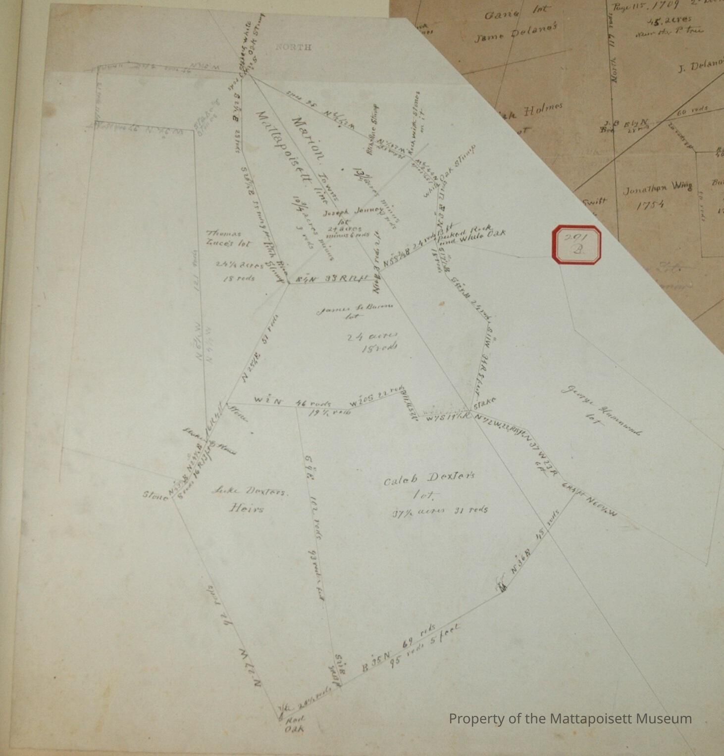 Marion/Mattapoisett town line. Thomas Luce’s lot at 24 ½ acres and 18 rods, Luke Dexter’s Heirs, Caleb Dexter’s lot at 37 ½ acres and 31 rods, George Hammond lot, James LeBaron lot at 24 acres and 18 rods, Joseph Jenney lot at 24 acres minus 6 rods (10 ¾ acres and 3 rods in Mattapoisett, 13 ¼ acres minus 3 rods in Marion).Acquisition