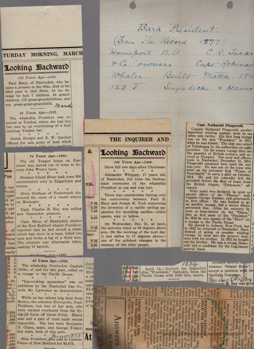 Handwritten notes and newspaper articles about Ship/Bark President.Collection