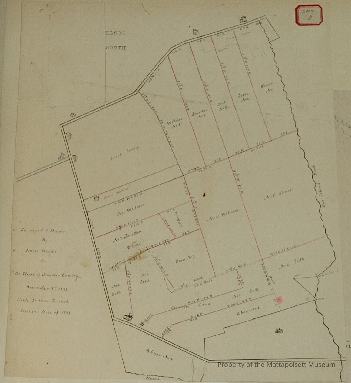 Surveyed and drawn by Ansel Weeks for the Heirs of Jonathan Cowing, December 5th, 1843. Scale 20 rods to the inch. Courses those of 1842. Divided into 18. Joseph Jenney, Ames Haskins, William (No. 5), Jonathan (No. 4) Seth (No. 3), Isaac (No. 2), Almer (No.1), William (No. 1), Jonathan (No. 2, later T. Luce), L. R. Gerrish, Seth (No. 1), Isaac (No. 2), Isaac (No. 3), William (No. 4), Almer (No. 5), Seth (No. 1), Abner (No. 3), Seth (No. 6), Abner (No. 4).Acquisition