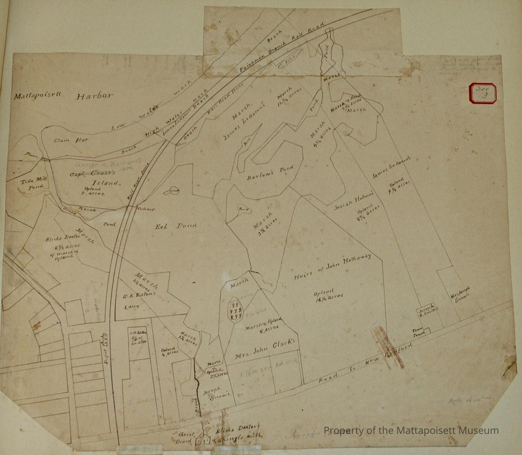 Lots on Mattapoisett harbor. South of Road to New Bedford. Railroad runs through. Elisha Dexter’s Shingle Mill, Mrs. John Clark, S. K. Eaton’s, Heirs of John Hathaway, Josiah Holmes’, Mrs. Joseph Snow’s, Joseph E. Smith, Town Pound, James LeBaron, Tide Mill Pond, Capt. Cross’ Island (later George M. Barnard’s - 1876), Eel Pond, Barlow’s Pond, several marsh areas.Acquisition