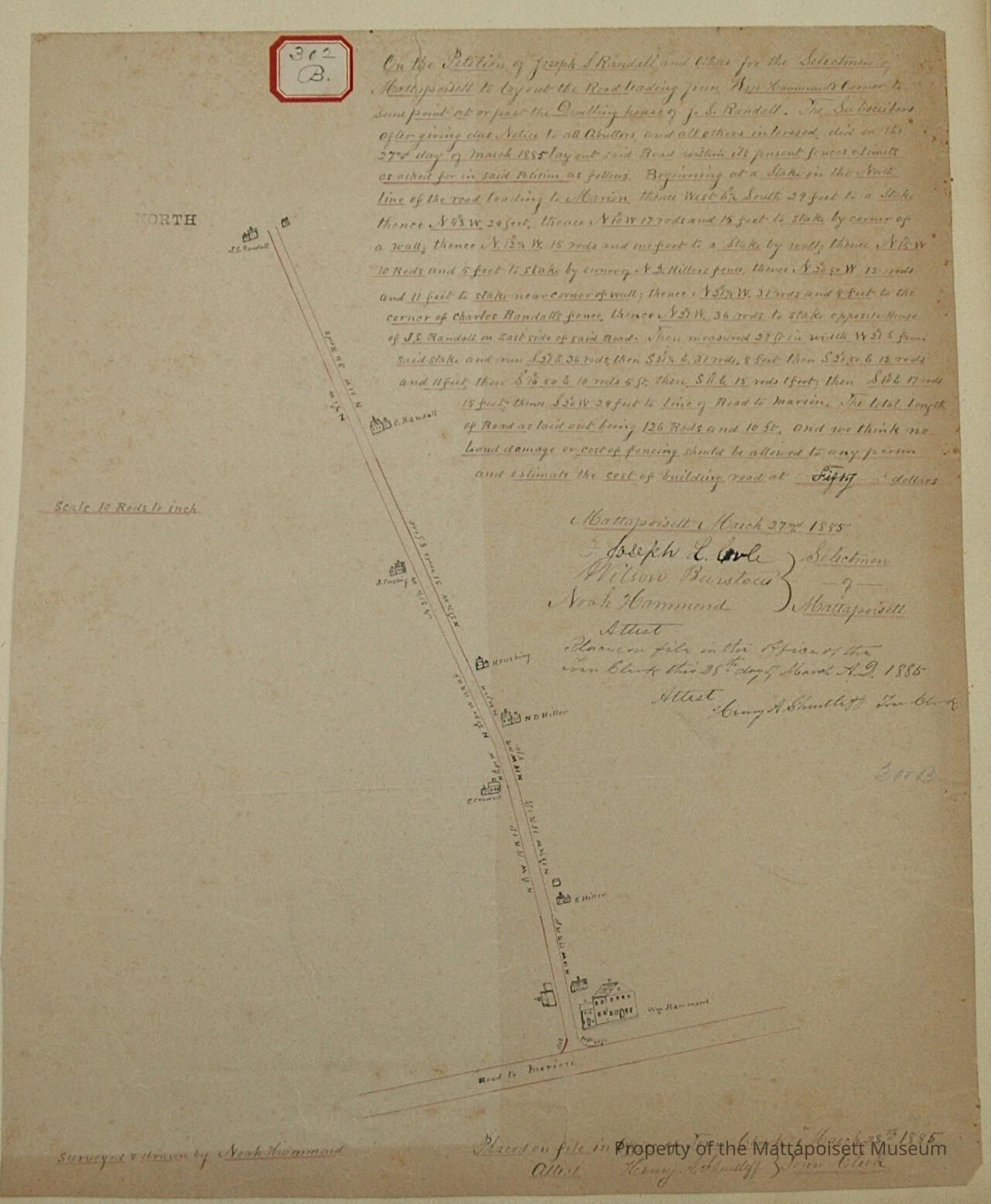 On the Petition of Joseph S. Randall and others for the Selectmen of Mattapoisett to lay out the road leading from William Hammond’s corner to some point at or past the dwelling house of J. S. Randall. The Subscribers after giving due notice to all abuttors and all others interested did on the 27th day of March 1885, lay out said Road within its present fences & limits as asked for in said Petition as follows.