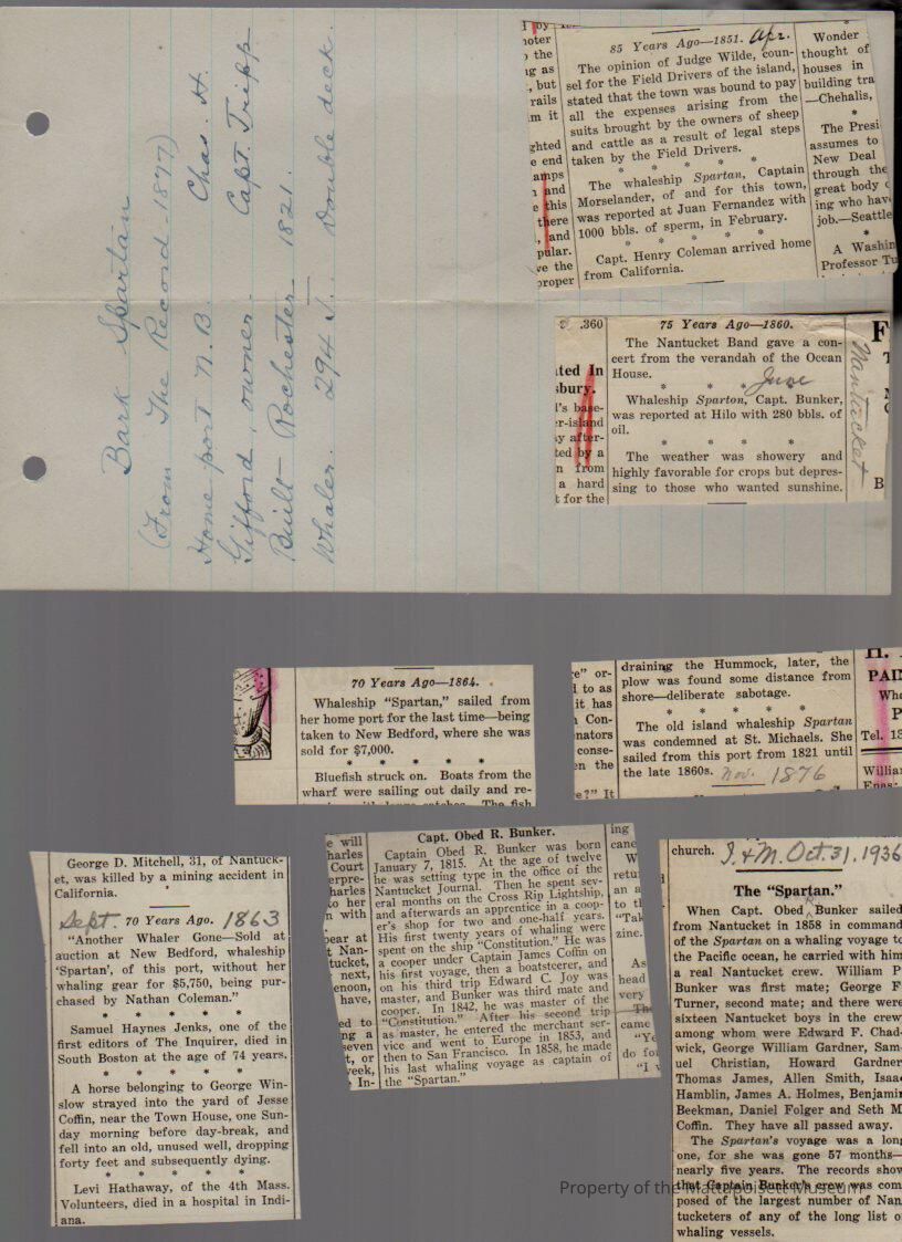 Handwritten notes and newspaper articles about Bark Spartan.Collection
