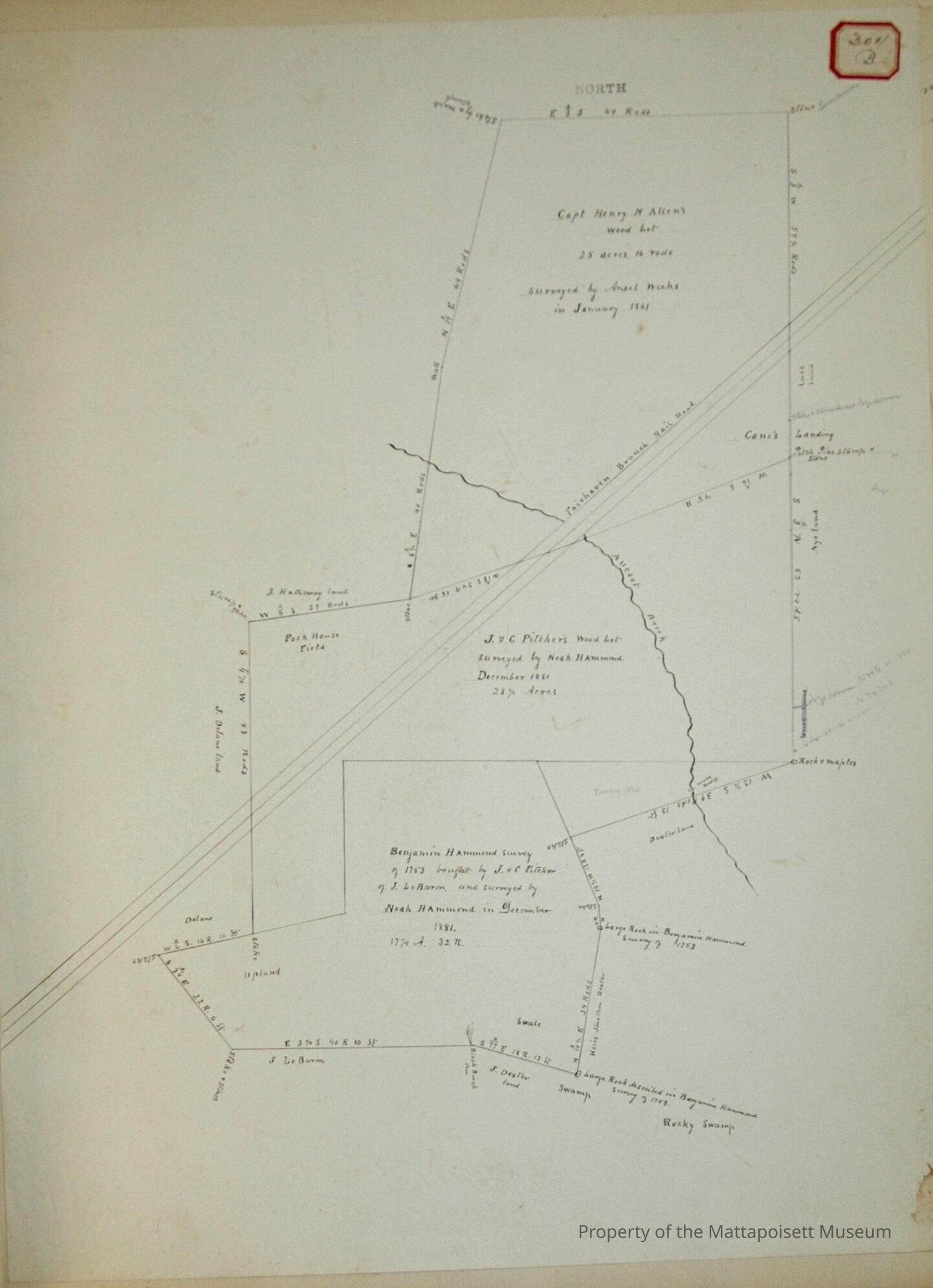 Three lots. #1. Capt. Henry M. Allen’s wood lot. 25 acres and 16 rods. Surveyed by Ansel Weeks in January 1861. #2. J. and C. Pitcher’s wood lot. 23 ½ acres. Surveyed by Noah Hammond December 1881. #3. Benjamin Hammond survey of 1753 bought by J. and C. Pitcher of J. LeBaron and surveyed by Noah Hammon in December 1881. 17 ¼ acres and 32 rods. Delano, J. LeBaron, J. Hathaway abutting. On Rocky Swamp, Cane’s Landing. Fairhaven Branch Railroad and Aucoot Brook run through.Acquisition