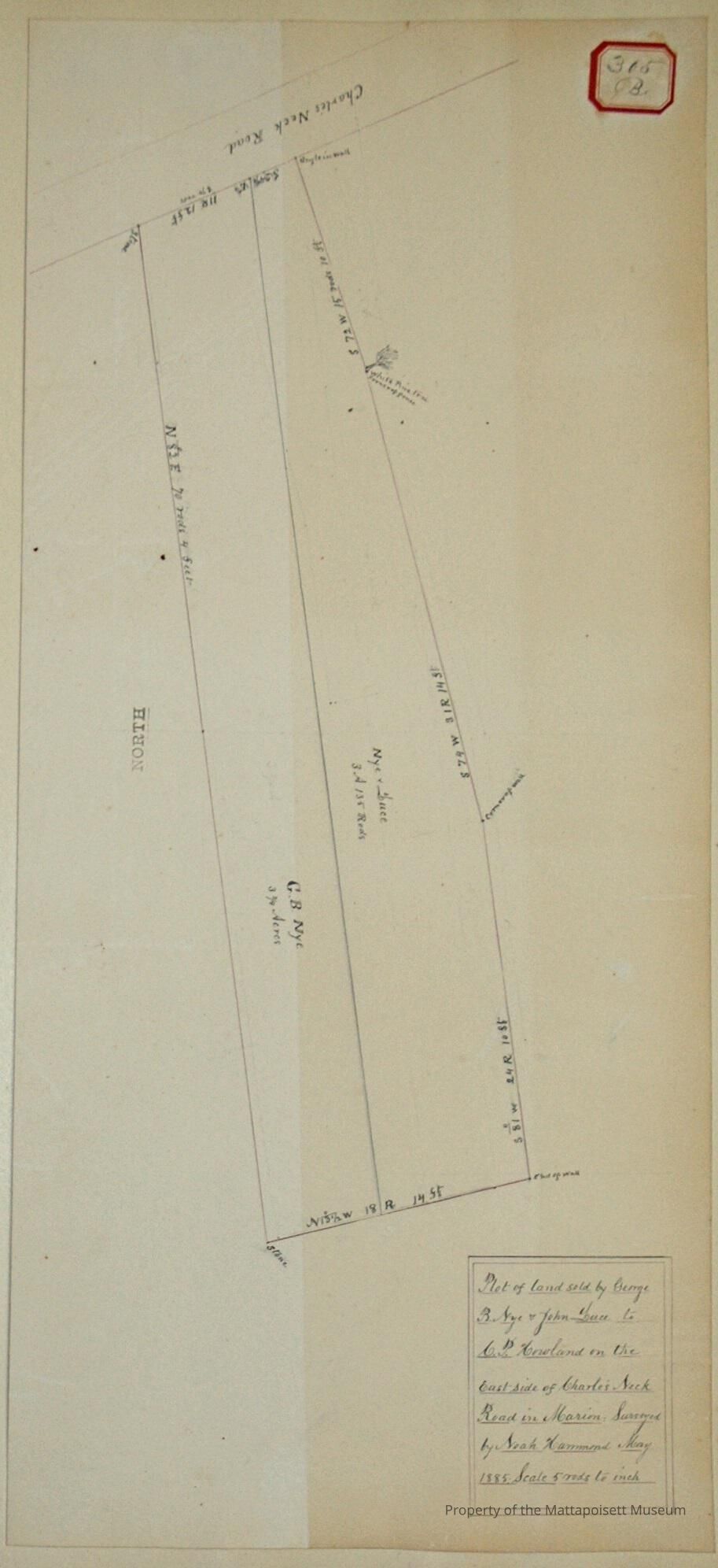 Plot of land sold by George B. Nye and John Luce to C. P. Howland on the east side of Charle’s Neck Road in Marion. Surveyed by Noah Hammond May 1885. Scale 5 rods to the inch. Nye and Luce plot at 3 acres and 135 rods. C. B. Nye plot at 3 ¼ acres.Acquisition