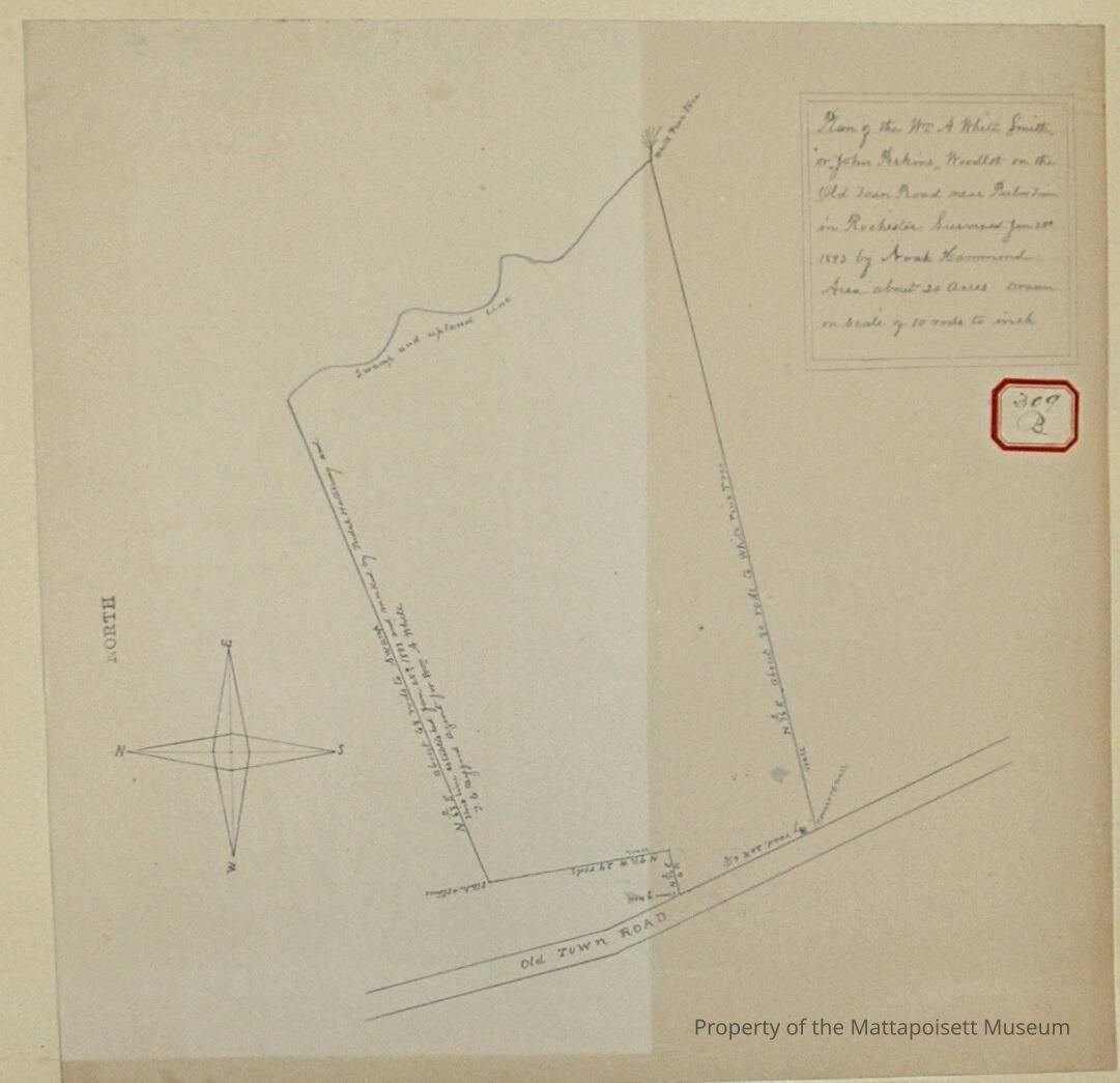 Plan of the Wiliam A. White "Smith" or "John Perkins" woodlot on the Old Town Road near Parlowtown in Rochester. Surveyed June 25, 1893 by Noah Hammond. Area about 20 acres. Drawn on scale of 10 rods to the inch. Northern line established June 25th 1893 and marked by Judah Hathaway and J. E. Gifford agent for William A. White.Acquisition