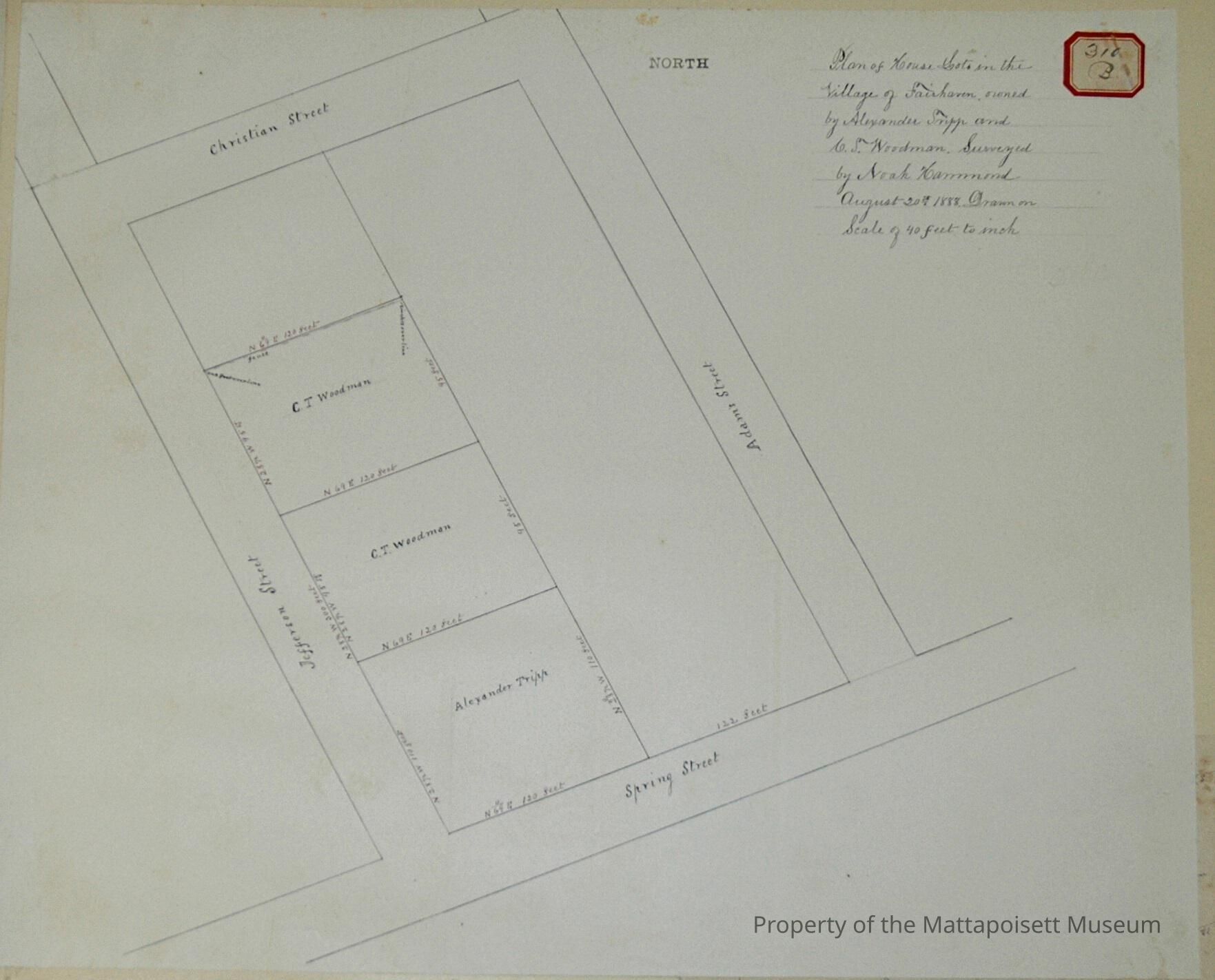 Plan of house lots in the Village of Fairhaven owned by Alexander Tripp and C. S. Woodman. Surveyed by Noah Hammond August 20th 1888. Drawn on a scale of 40 feet to the inch. Surrounded by Spring, Jefferson, Christian and Adams Streets. Lots for C. T. Woodman and Alexander Tripp.Acquisition