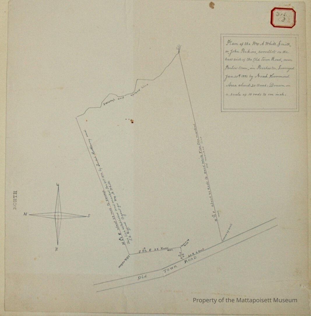 Plan of the William A. White "Smith" or "John Perkins" woodlot on the east side of the Old Town Road, near Parlowtown, in Rochester. Surveyed January 25th 1893 by Noah Hammond. Area about 20 acres. Drawn on a scale of 10 rods to the inch. This line established and marked January 25th 1893 by Josiah Hathaway and L. B. Gifford agent for William A. White.Acquisition