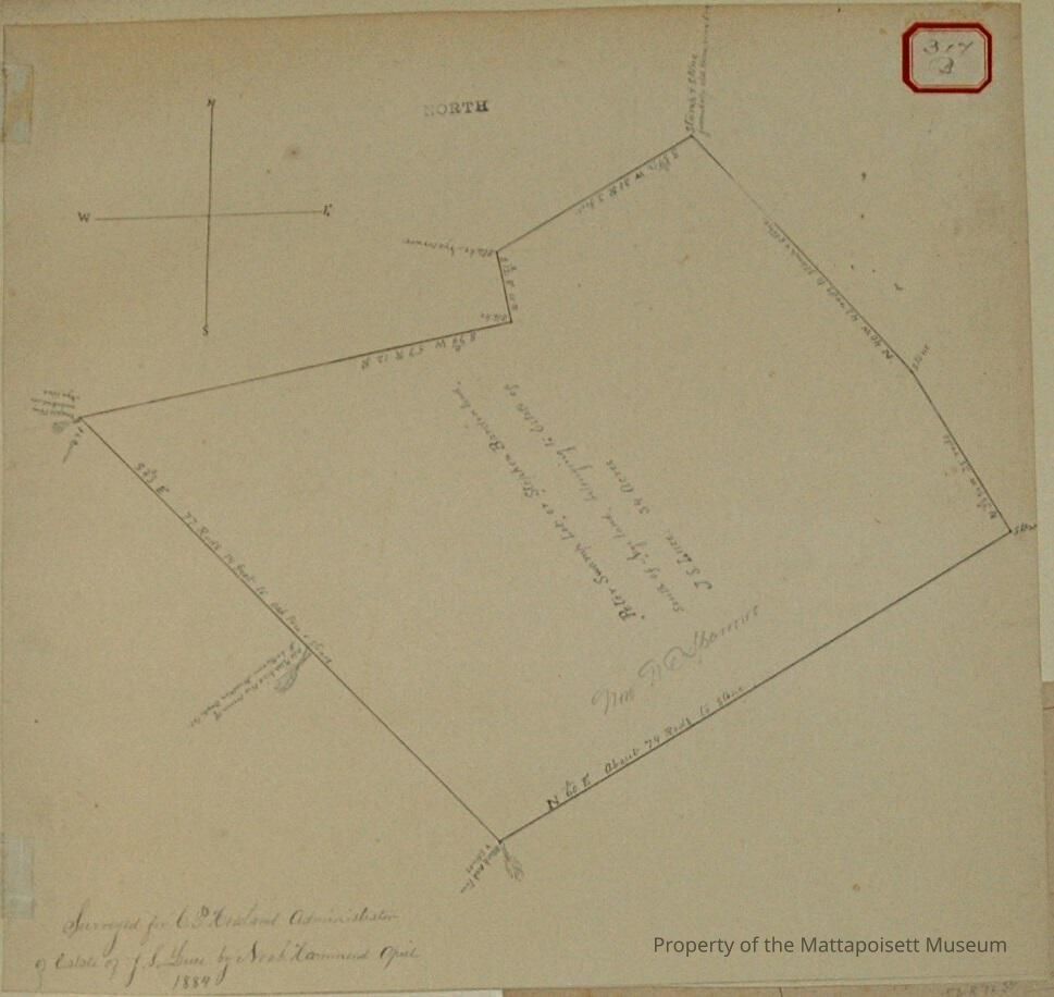 Surveyed for C. P. Howland, Administrator of estate of J. S. Luce by Noah Hammond, April 1884. "Peter Swamp" lot or "Stephen Barden land", south of "Nye land", belonging to the estate of J. S. Luce. 34 acres. Now W. E. Sparrow.Acquisition