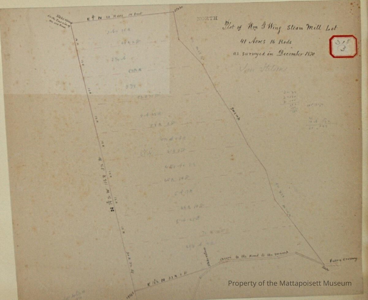 Plot of William G. Wing Steam Mill lot, now Stetsons. 41 acres and 16 rods as surveyed in December 1870. Divided into 9 lots.Acquisition