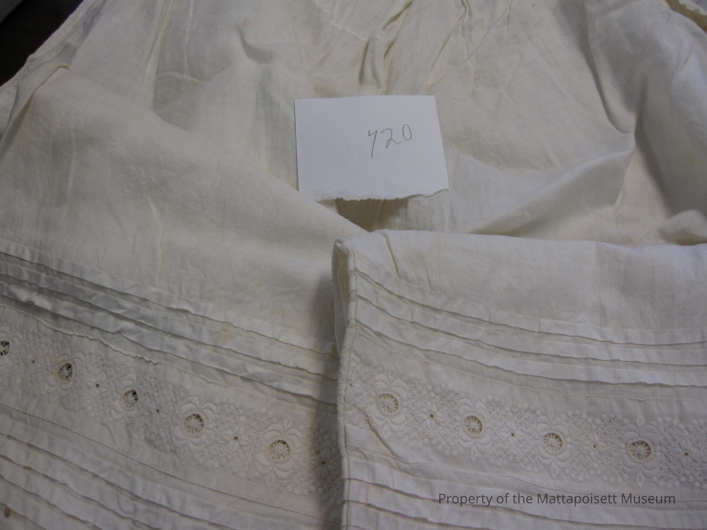 Notes: Notecard: Pantaloons. White cotton, eyelets and tucking on hem.