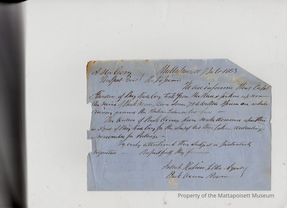 Letter from Jonah Robinson, agent for Bark Ocean Rover to A. H. Cory, agent for Brig Kate Cory, requesting payment for taking 75-100 bbls. Of sperm oil taken.Collection