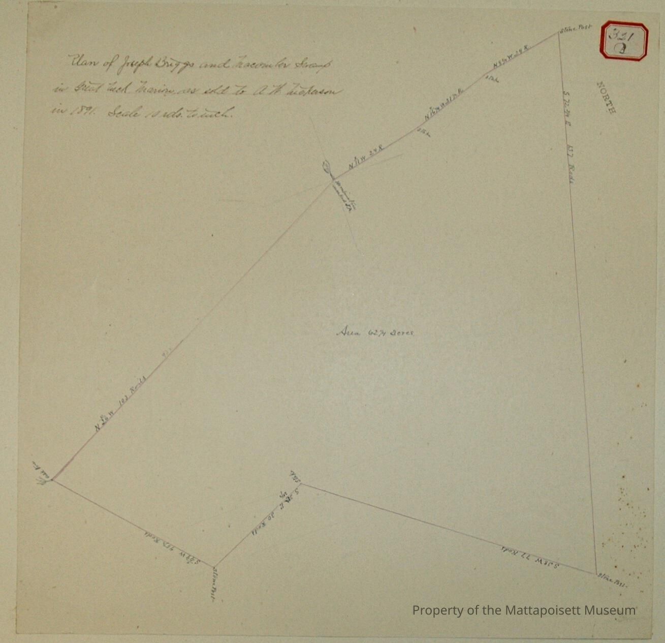 Plan of Joseph Briggs and Macomber swamp in Great Neck Maion as sold to A. W. Nickerson in 1891. Scale 10 rods to the inch. 62 ¼ acres.Acquisition
