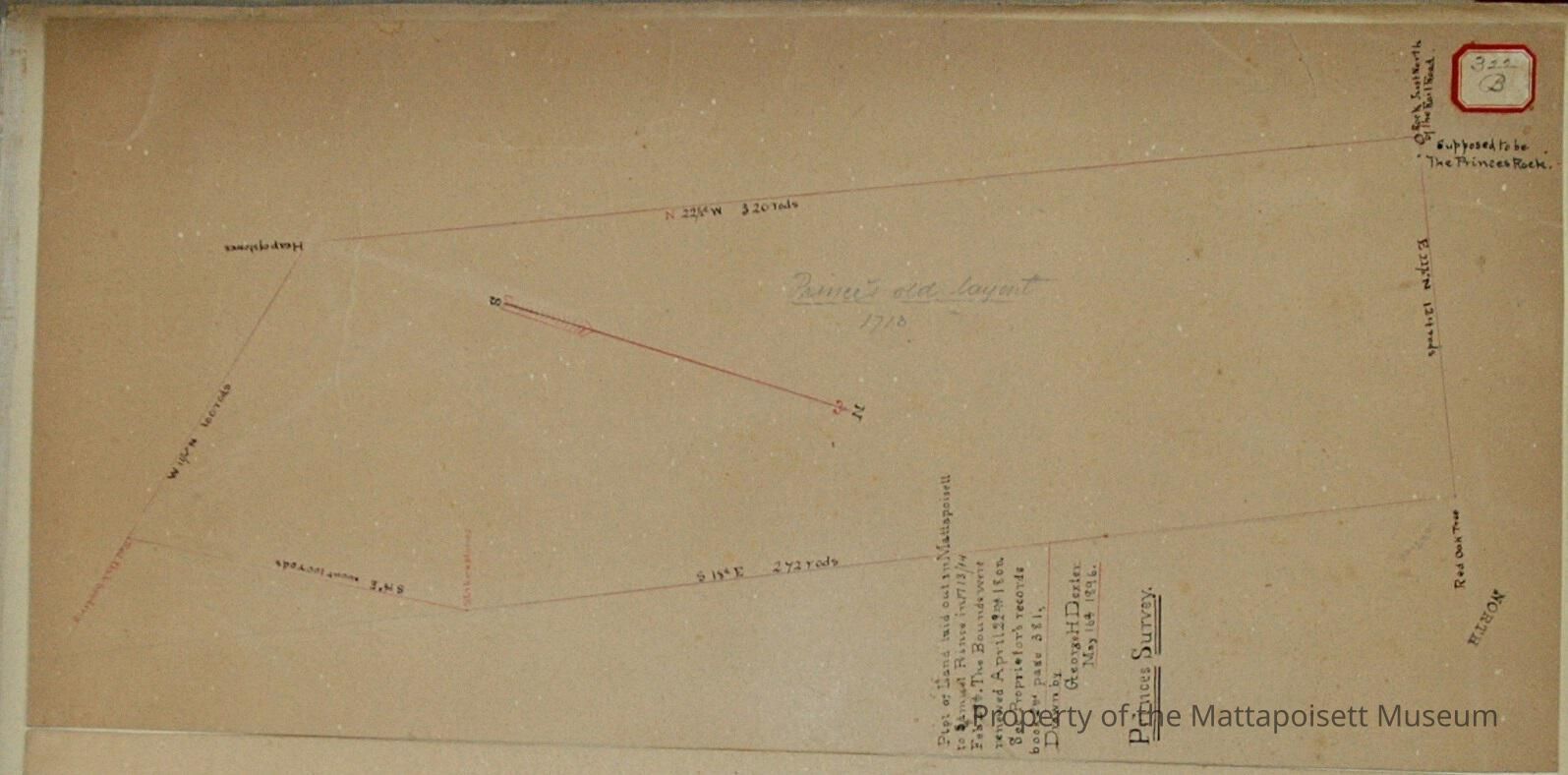 Plot of land laid out in Mattapoisett to Samuel Prince in 1713/1714 February 28th. The bounds were renewed April 22nd 1800. See Proprietor’s records book 2nd page 381. Drawn by George H. Dexter, May 16th 1896.Acquisition