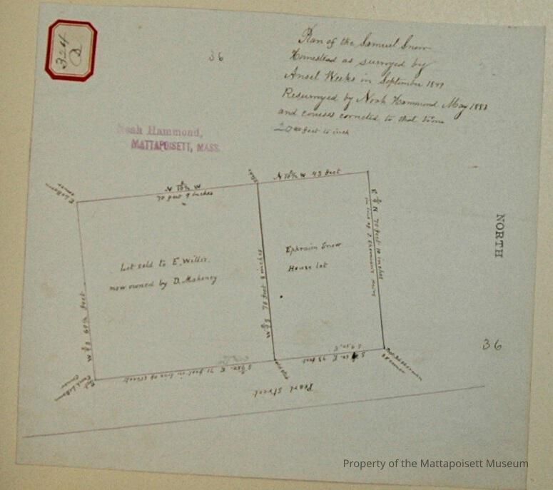 Plan of the Samuel Snow Homestead as surveyed by Answel Weeks in September 1849. Resurveyed by Noah Hammond May 1883 and courses corrected to that time. Scale 20 feet to the inch. Two lots. #1 Land sold to E. Willis, now owned by D. Mahoney, Ephraim Snow house lot. On Pearl Street.Acquisition
