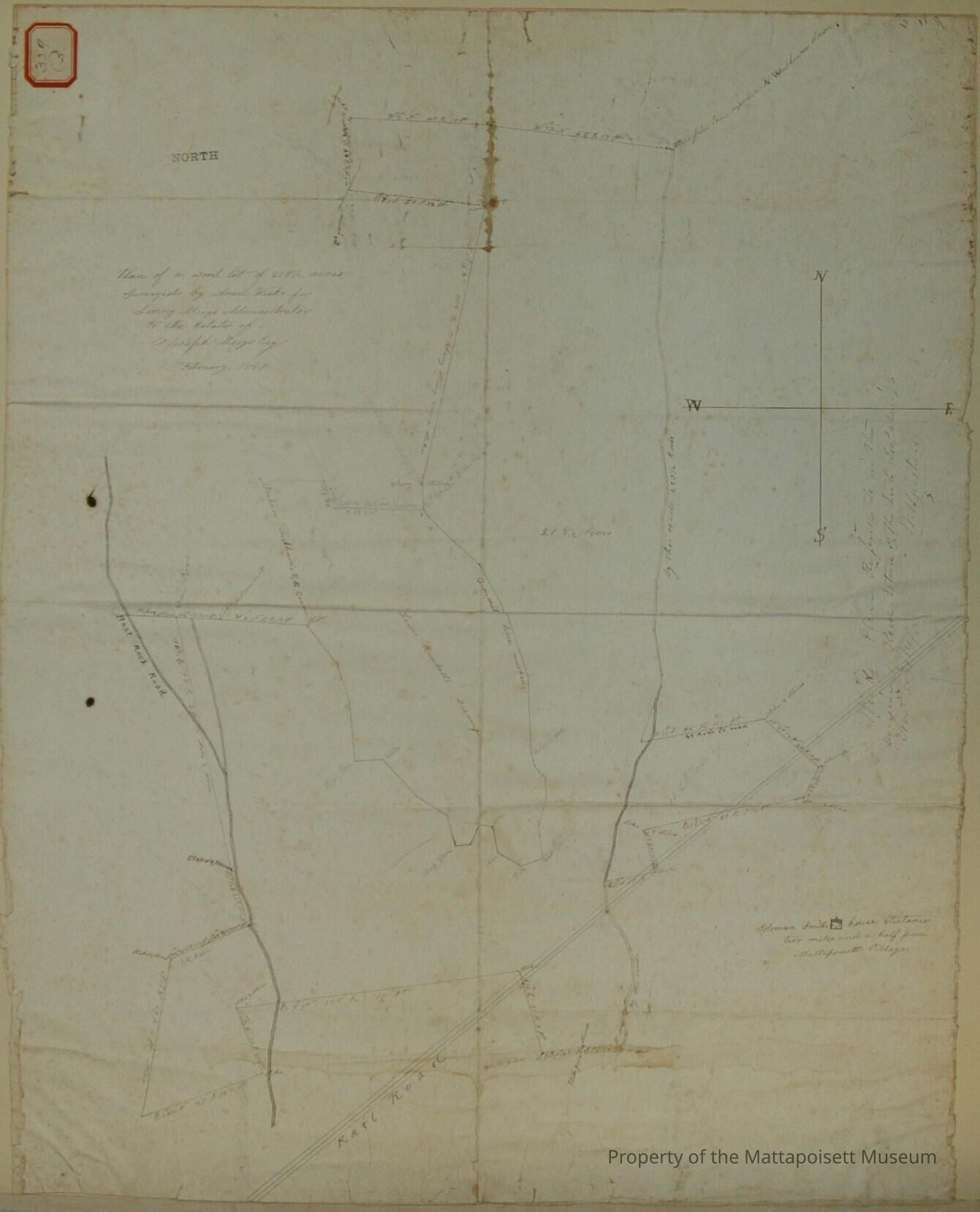 Plan of a wood lot of 218 1/2 acres surveyed by Ansel Weeks for Loring Meigs Administrator to the estate of Joseph Meigs, Esq. February 1847. Solomon Smith's house distance two miles and a half from Mattapoisett Village. Boat-rock Road and Railroad runs through. Lewis Randall's swamp in the middle.Acquisition