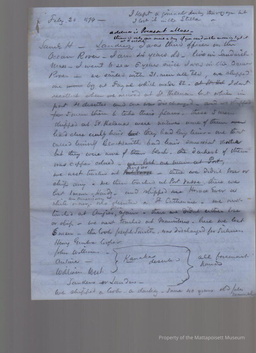 Notes, probably of Lemuel LeBaron Holmes, taking statement of Samuel H. Landers or Sanders (third officer on Bark Ocean Rover c. 1873) detailing experience.Collection
