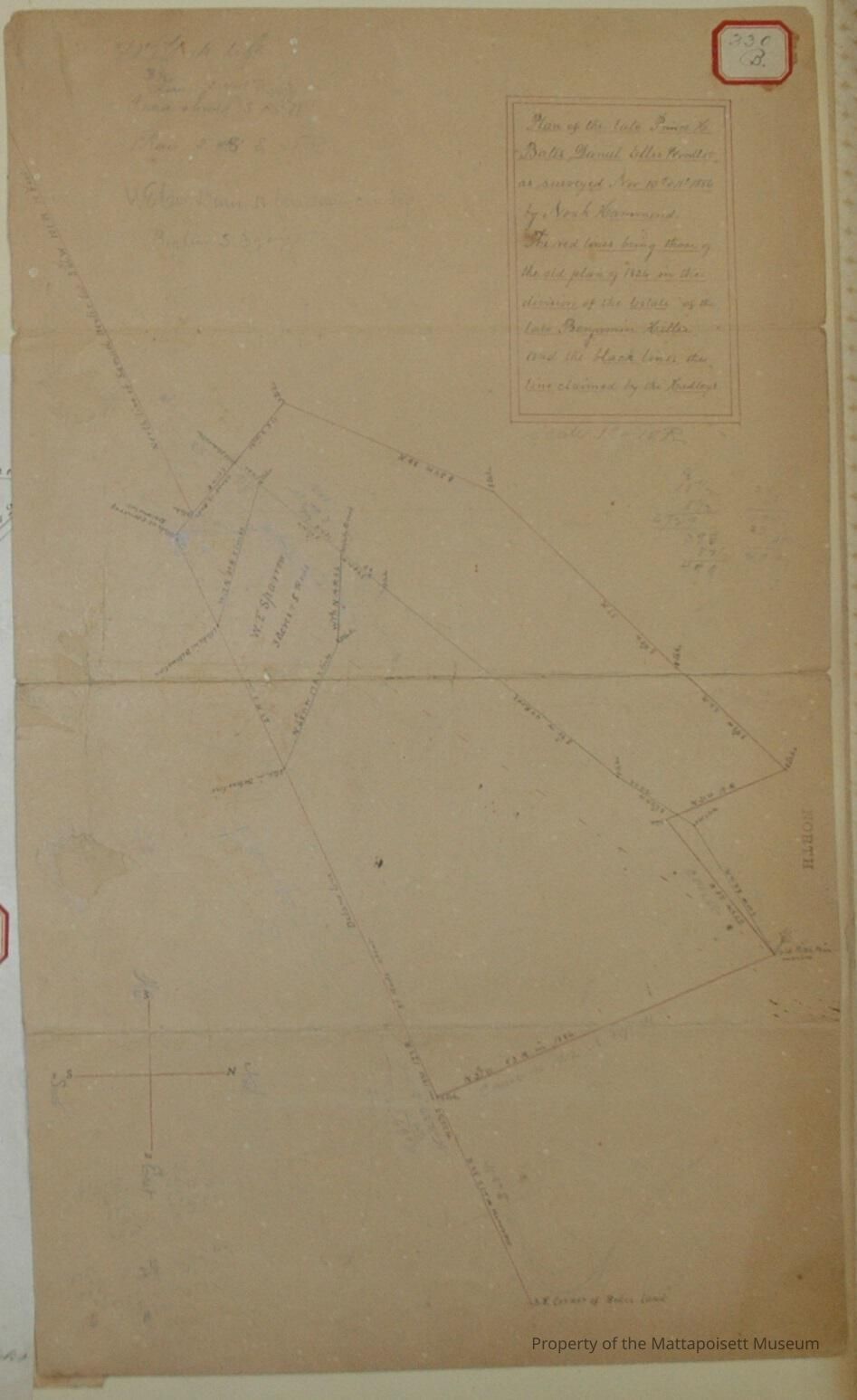 Plan of he late Prince H. Bolles "Daniel Ellis woodlot" as surveyed by Noah Hammond. The red lines being those of the old plan of 1826 in the division of the estate of the late Benjamin Hiller and the black lines the line claimed by the Hadley's. W. E. Sparrow, Samuel Dexter, Delano, Bolles abutting.Acquisition