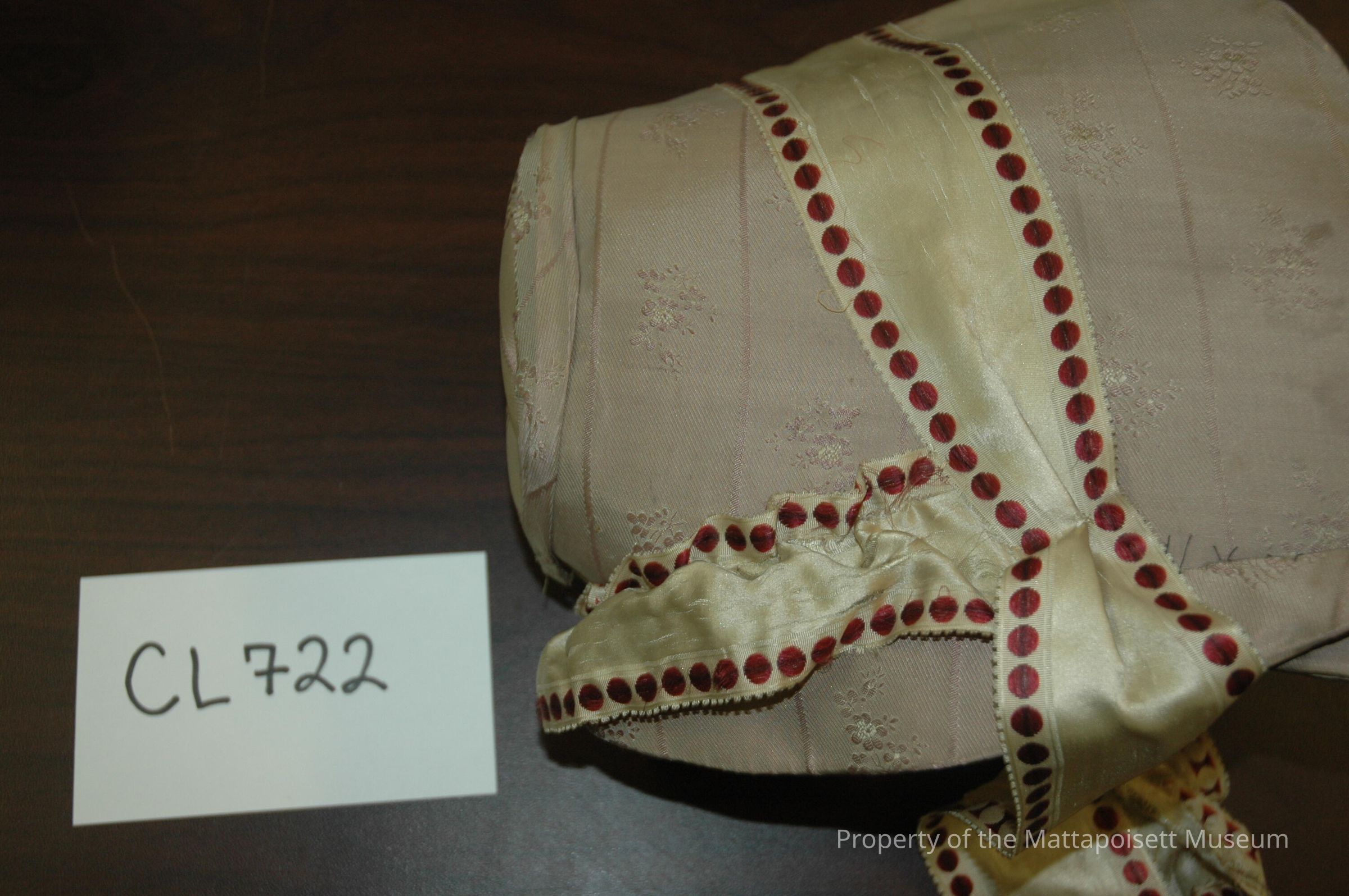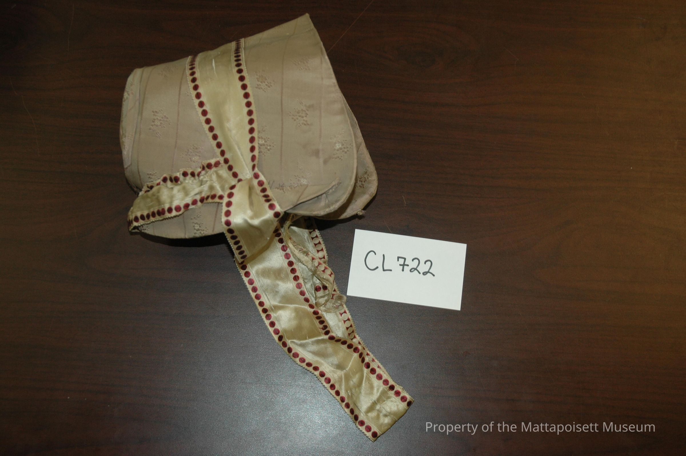 Tan bonnet, silk brocade. Ribbon applique, maroon dots.Collection
