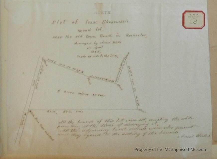 Plot of Isaac Shearman's wood lot near the old town pound in Rochester. Surveyed by Ansel Weeks in April 1868. Scale 10 rods to the inch. All the bounds of this lot were set accepting the white pine tree at the time of surveying it. All the adjioning land owners were also present and they agreed to the setting of the bounds. Area 5 acres minus 25 rods.Acquisition