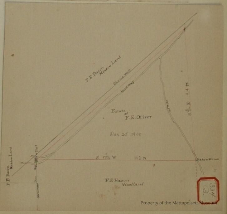 Estate of F. E. Oliver. October 25, 1900. F. E. Bacon meadow land and wood land surround. Old Road runs through.Acquisition