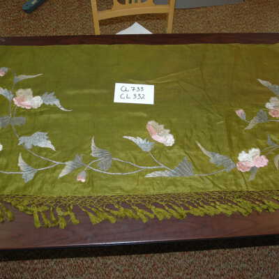 Silk shawl, green embroidered leaves and flowers of pink, gray and white. Hand done. Net tassel trim.Collection