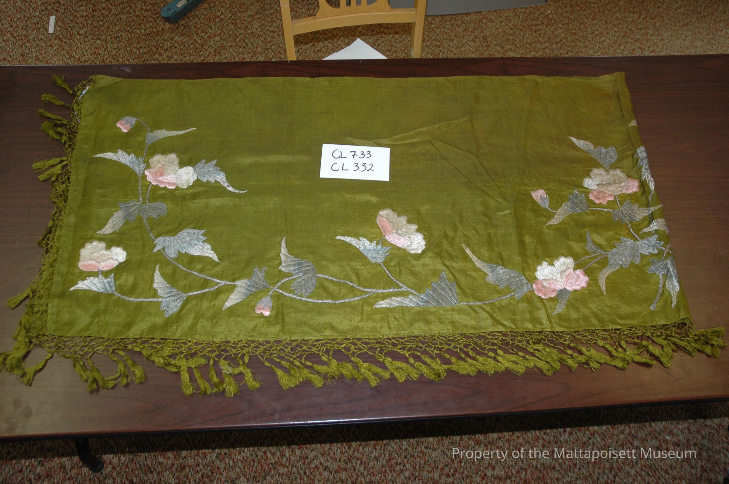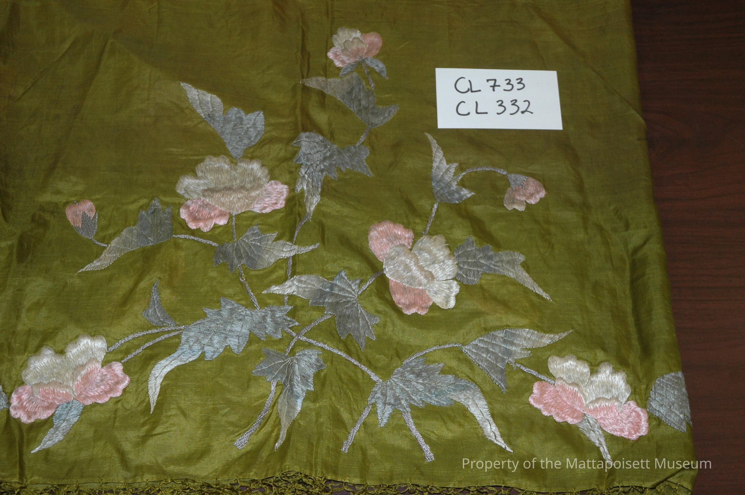 Notes: Notecard: Silk shawl, green embroidered leaves and flowers of pink, gray and white. Hand done. Net tassel trim.