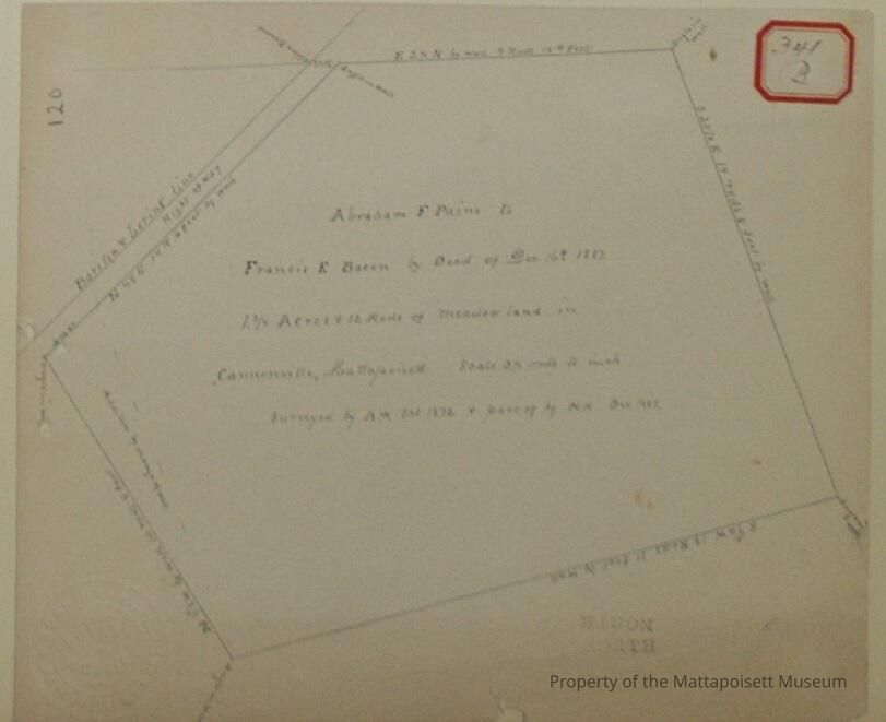 Abraham F. Paine to Francis E. Bacon by deed of December 16, 1887. 1 ¾ acres and 12 rods of meadow land in "Cannonville", Mattapoisett. Scale 2 ½ rods to the inch. Surveyed by Ansel Weeks October 1872 and part of by Noah Hammond December 1887.Acquisition