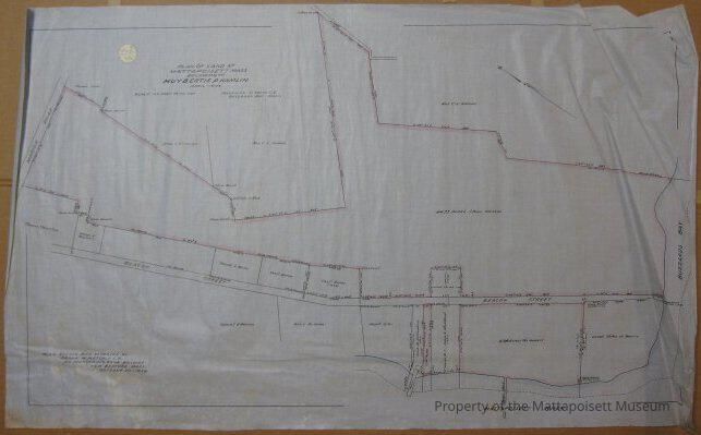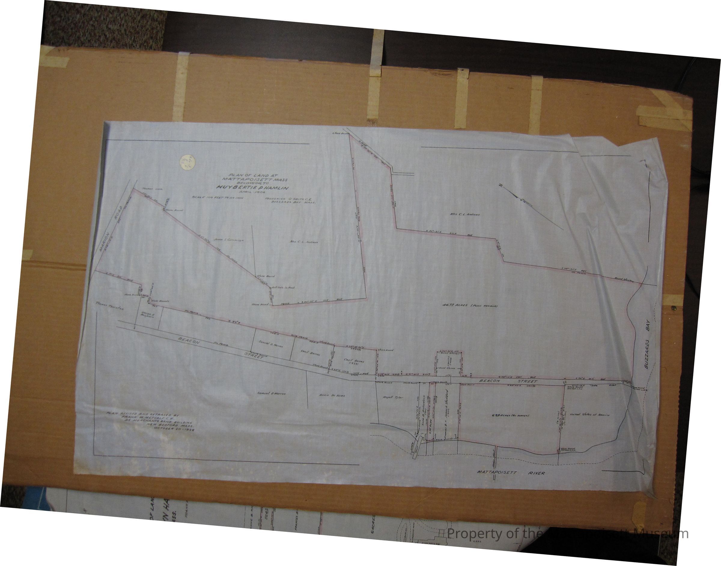 Plan of land at Mattapoisett, Mass belonging to Huybertie Pruyn Hamlin. April 1906. Plan revised and retraced by Frank M. Metcalf C. E. October 20, 1928. Mattapoisett River, Beacon Street, Marion Road. Mrs. C. L. Andrews, Jason L. Cummings, Samuel D. Warren, Cecil Barnes, Annie DeKoren, Anne B. Richardson, James K. Stoddard, Thomas Thurston, George H. Benjamin properties.