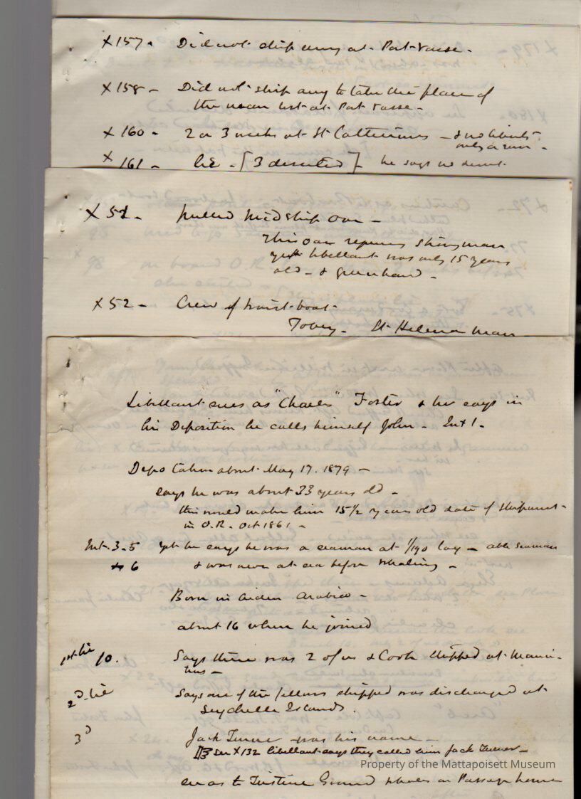 Handwritten notes, probably by Lemuel LeBaron Holmes, noting schedule of events, also notes "Libillant sues as "Charlie" Foster & he says in his deposition he calls himself John. Int 1."Collection