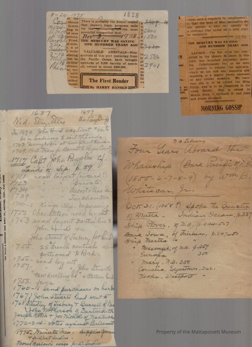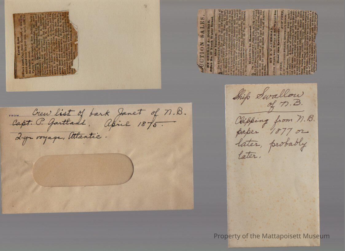 Handwritten notes with newspaper clippings, crew list of Bark Janet, auction of Ship Swallow, whale product arrivals, ship launch.Collection