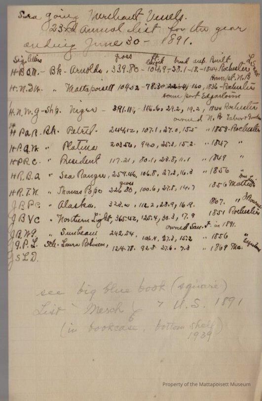 Handwritten notes on sea going merchant vessels, 23rd annual list for the year ending June 30, 1891Collection