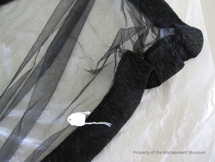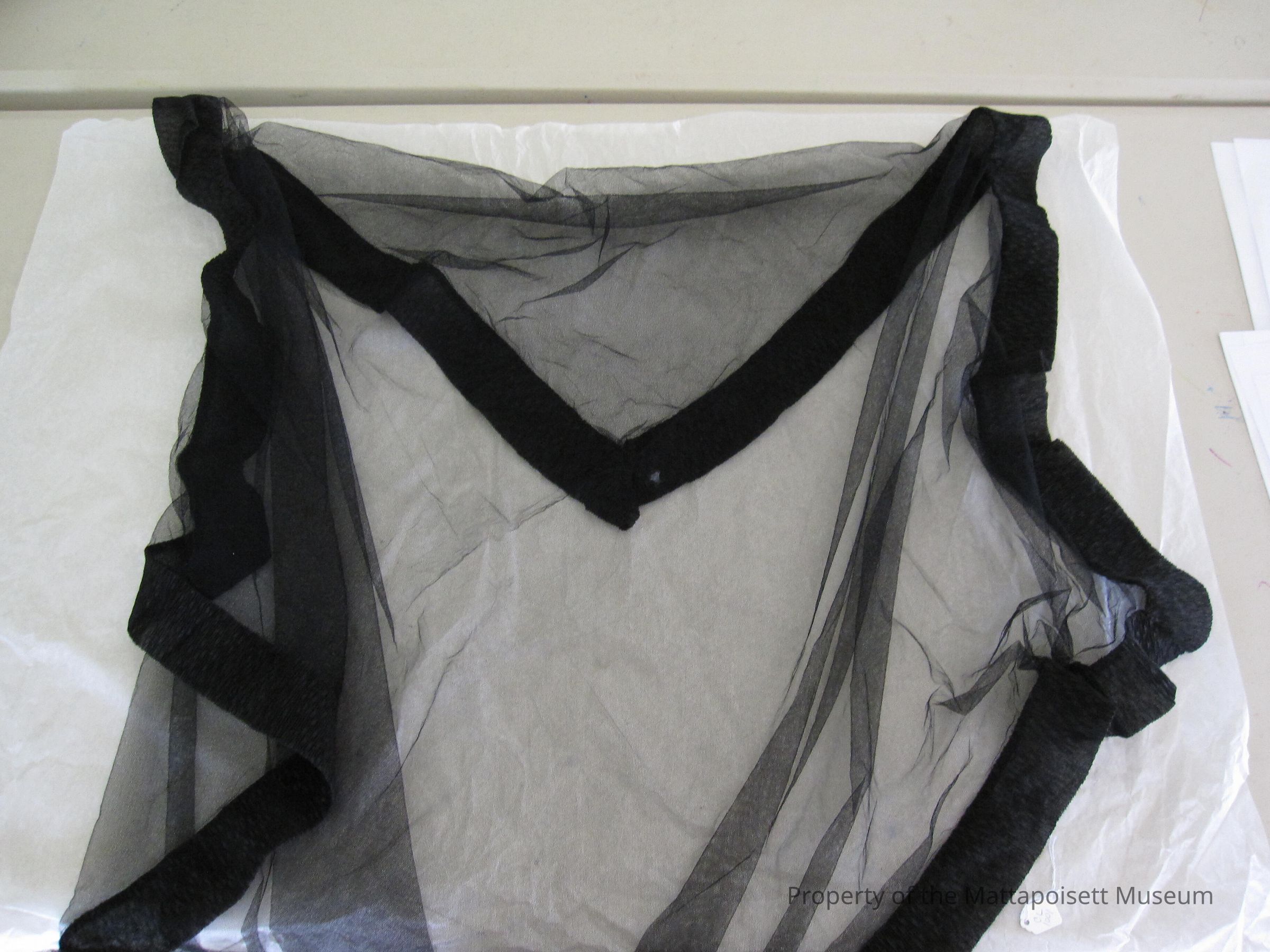 Notes: Notecard: Black net shawl with pleated crepe border.