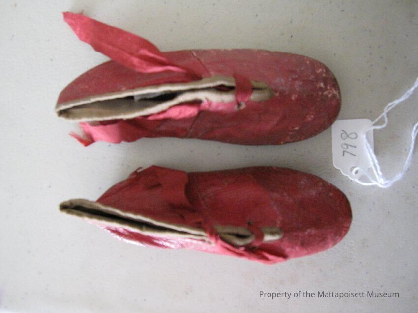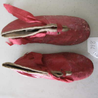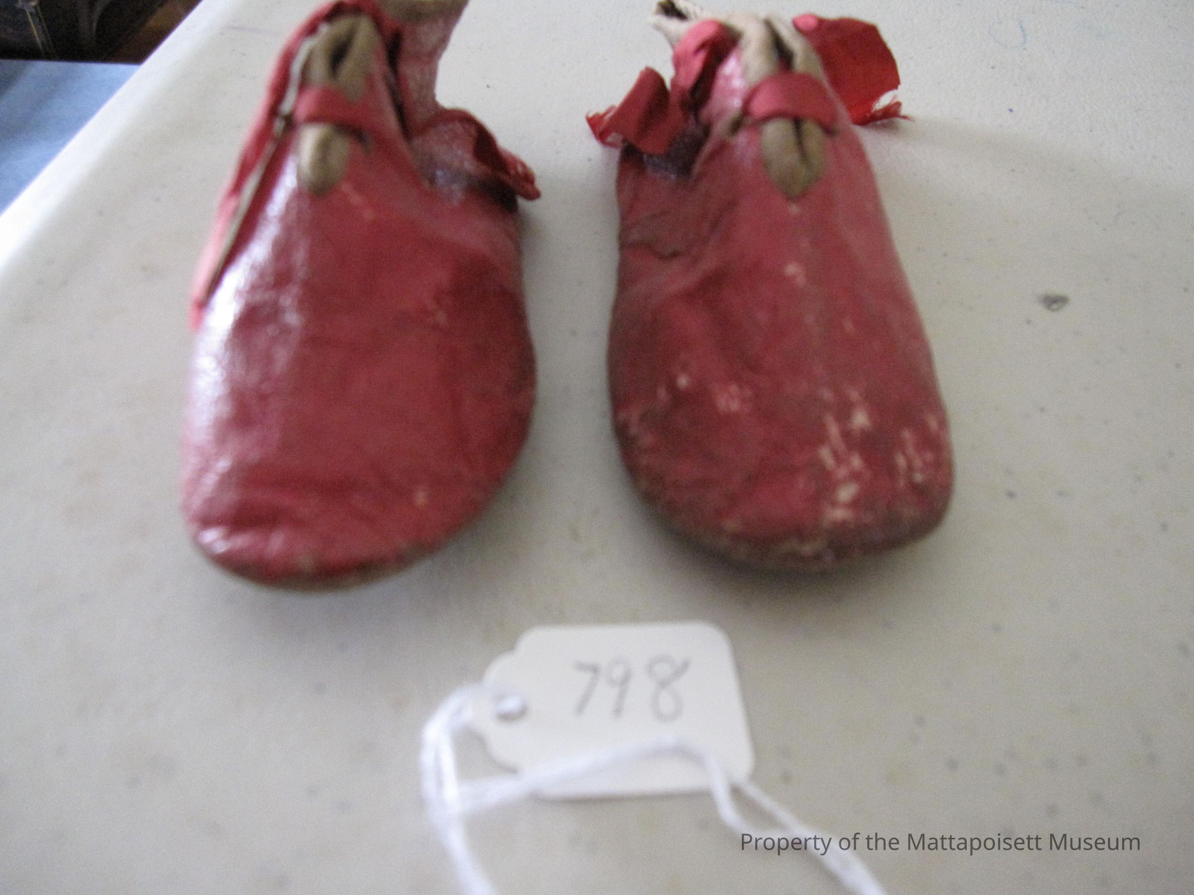Notes: Notecard: Child's soft red leather slippers. Red ribbon closures, soft sole.