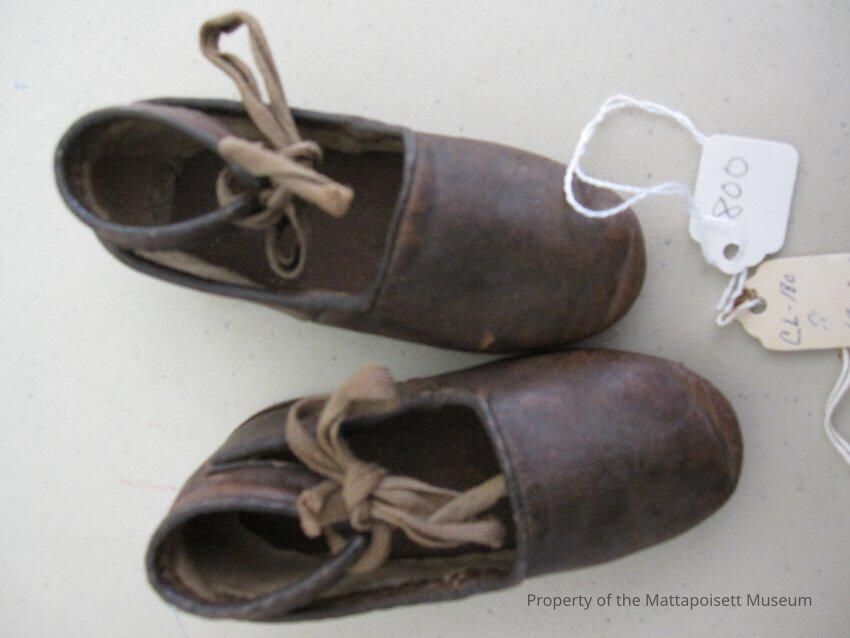 Notes: Notecard: Baby's brown leather slippers. Ties, hard sole.