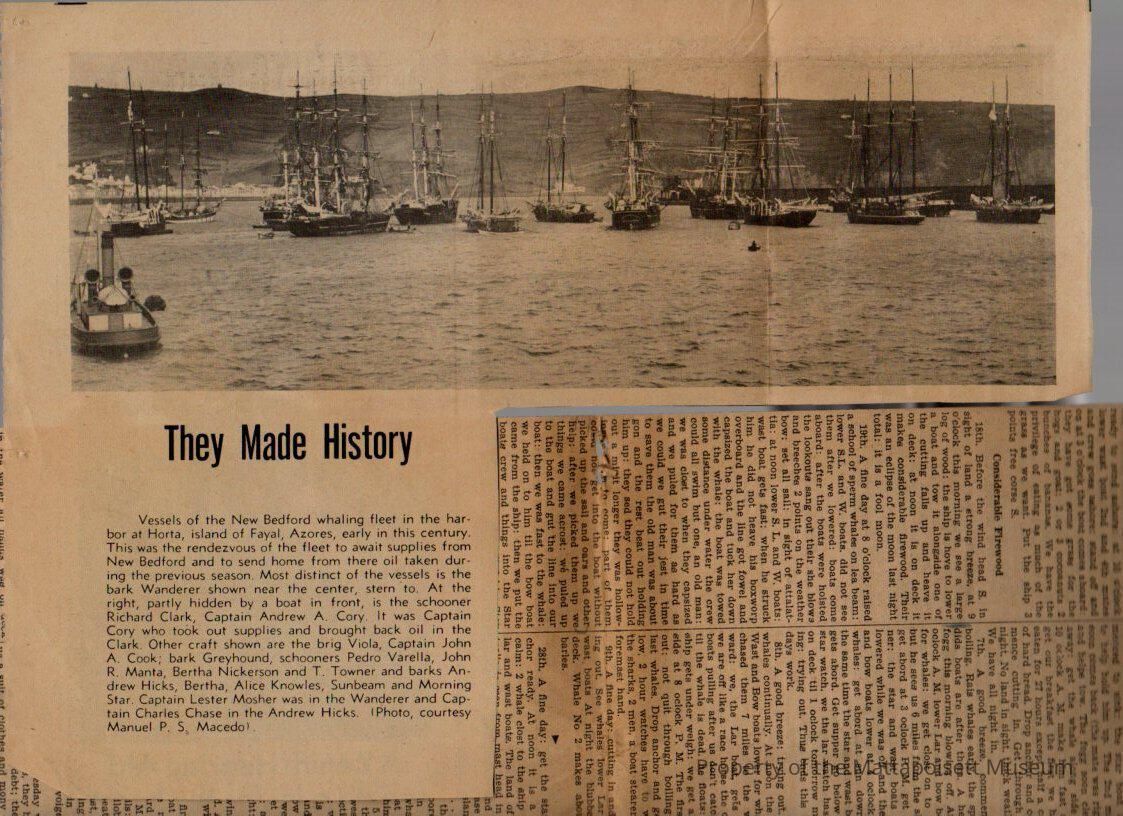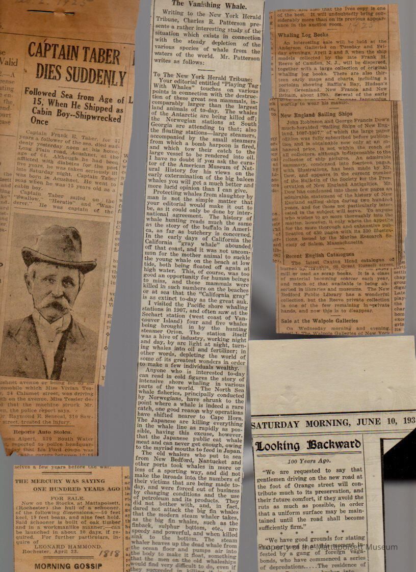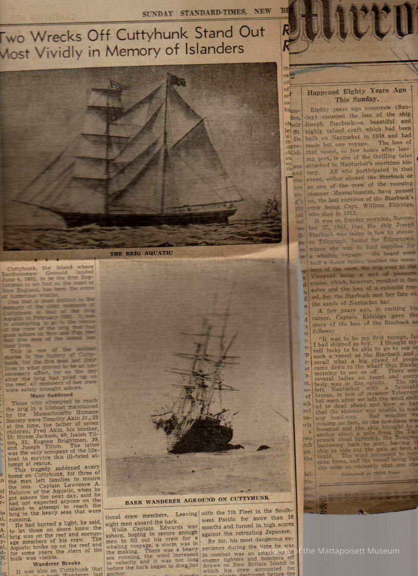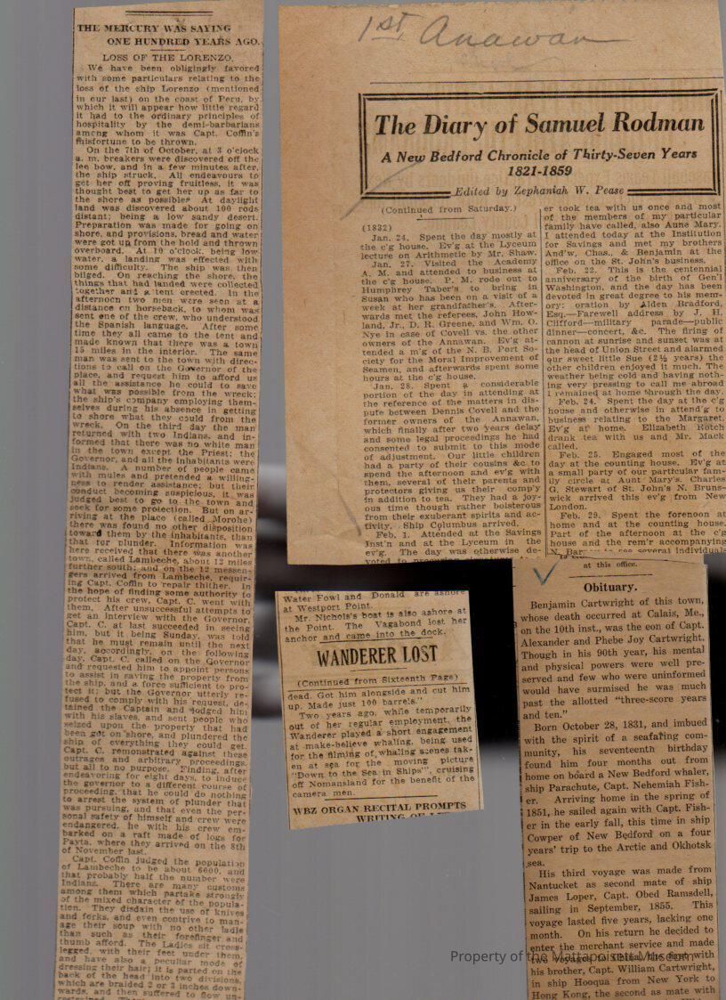 Newspaper clippings on ships and sailors. Wanderer Lost and its wreck on Cuttyhunk, Benjamin Cartwright obituary, diary of Samuel Rodman, Loss of the Lorenzo, Frank R. Taber (captain) obituary, looking back/one hundred years ago, log books, sailing shipsCollection