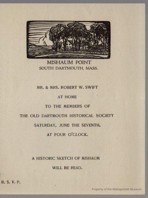Invitation to Mishaum Point, the home of Mr. & Mrs. Robert W. Swift for the members of the Old Dartmouth Historical Society. A historic sketch of Mishaum will be read.Collection