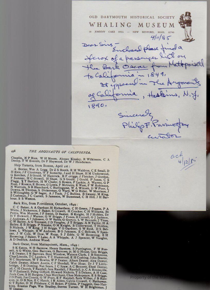 Letter from Philip F. Purrington, curator of Old Dartmouth Historical Society with enclosure of passenger list for Bark Oscar in The Argonauts of California (1890)Collection