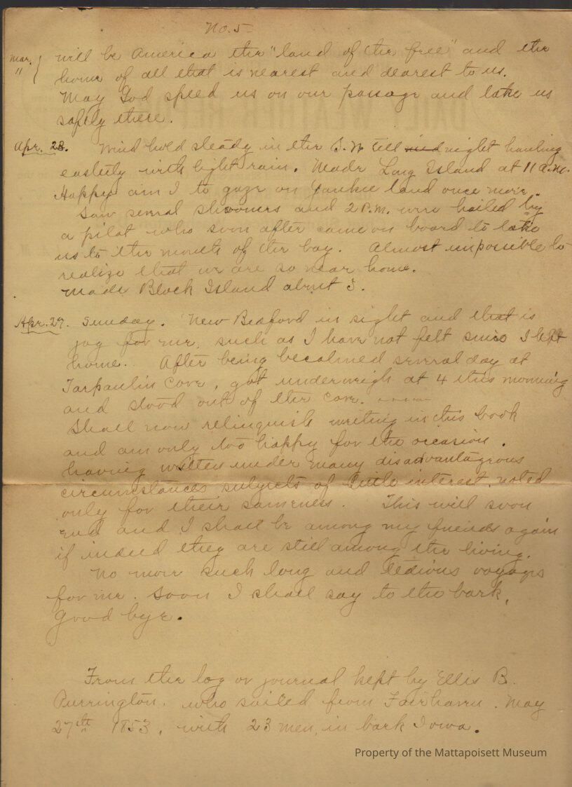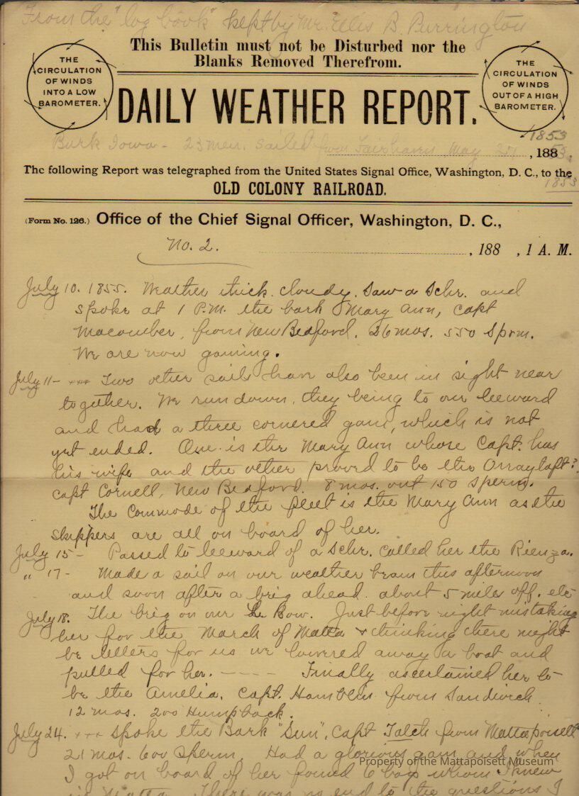 Handwritten notes, excerpts from the log book kept by Ellis B. Purrington, Bark Iowa, sailed from Fairhaven, MA, May 27, 1853.Collection