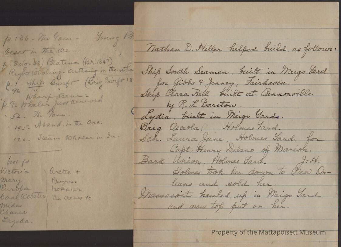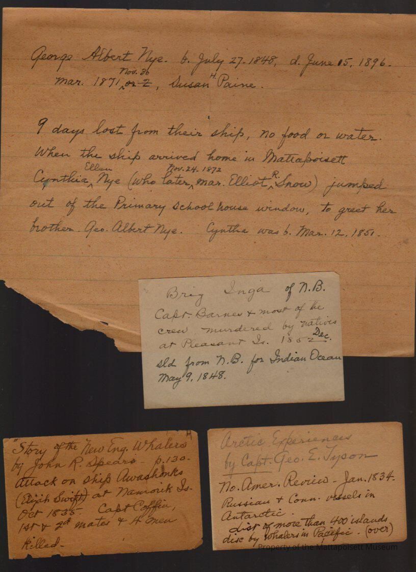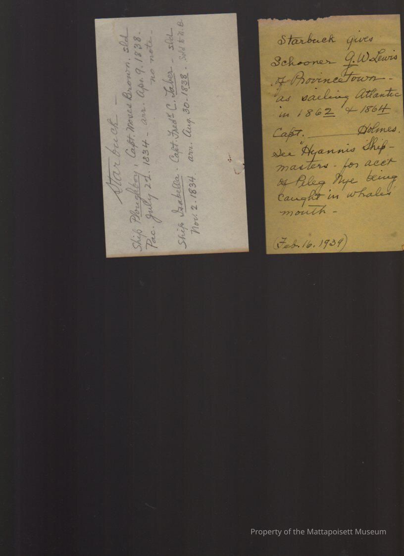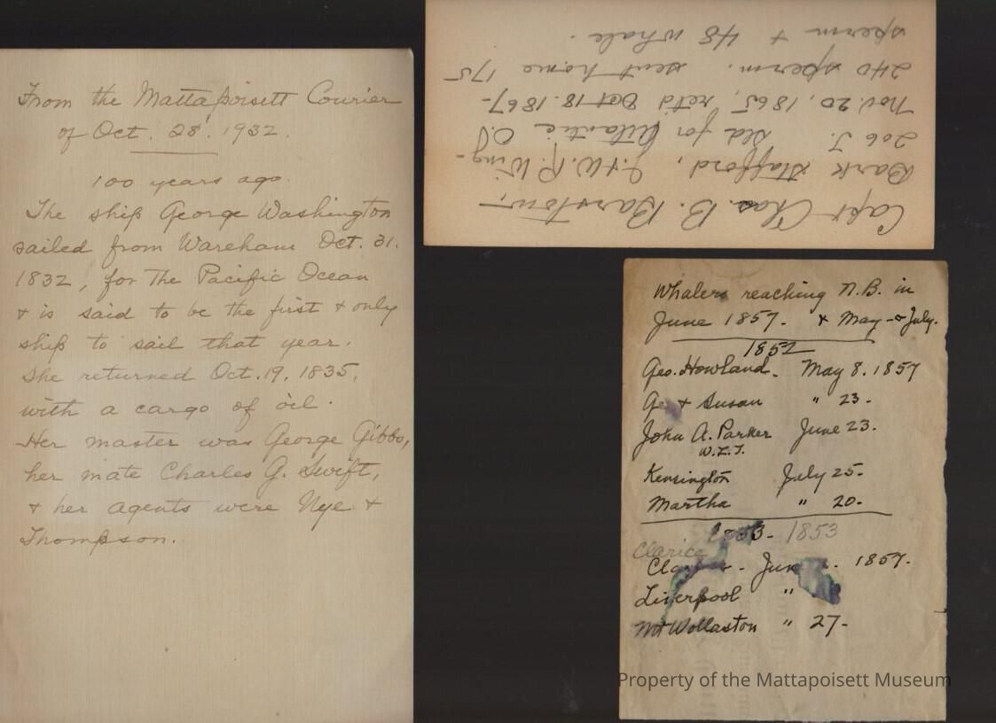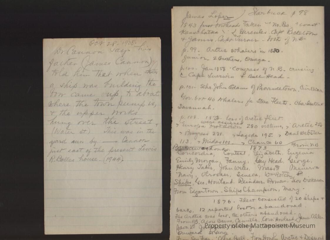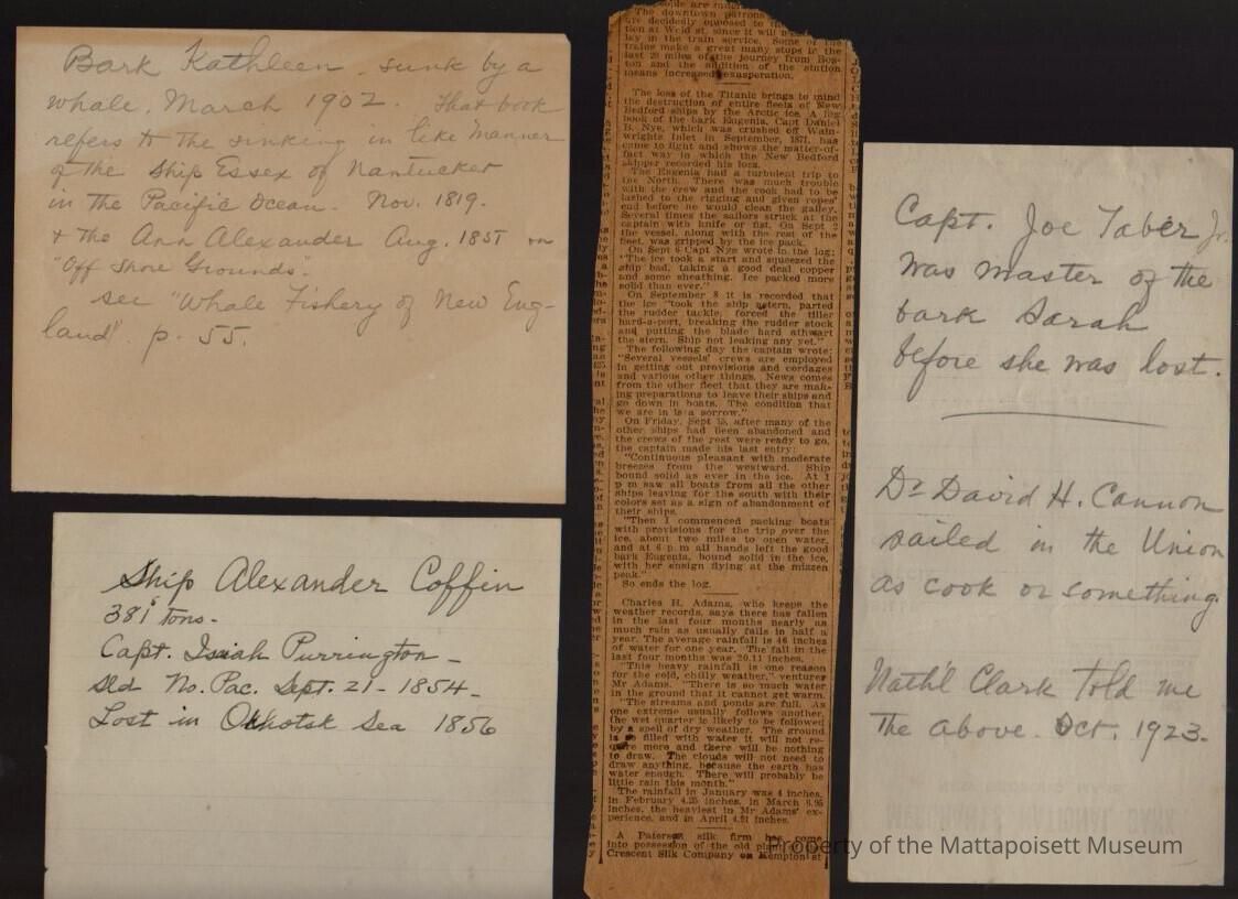 Handwritten notes, scraps of paper, excerpts, lists, copies, quotes, clippings pertaining to whaling, whaleships and persons associated with same.Collection