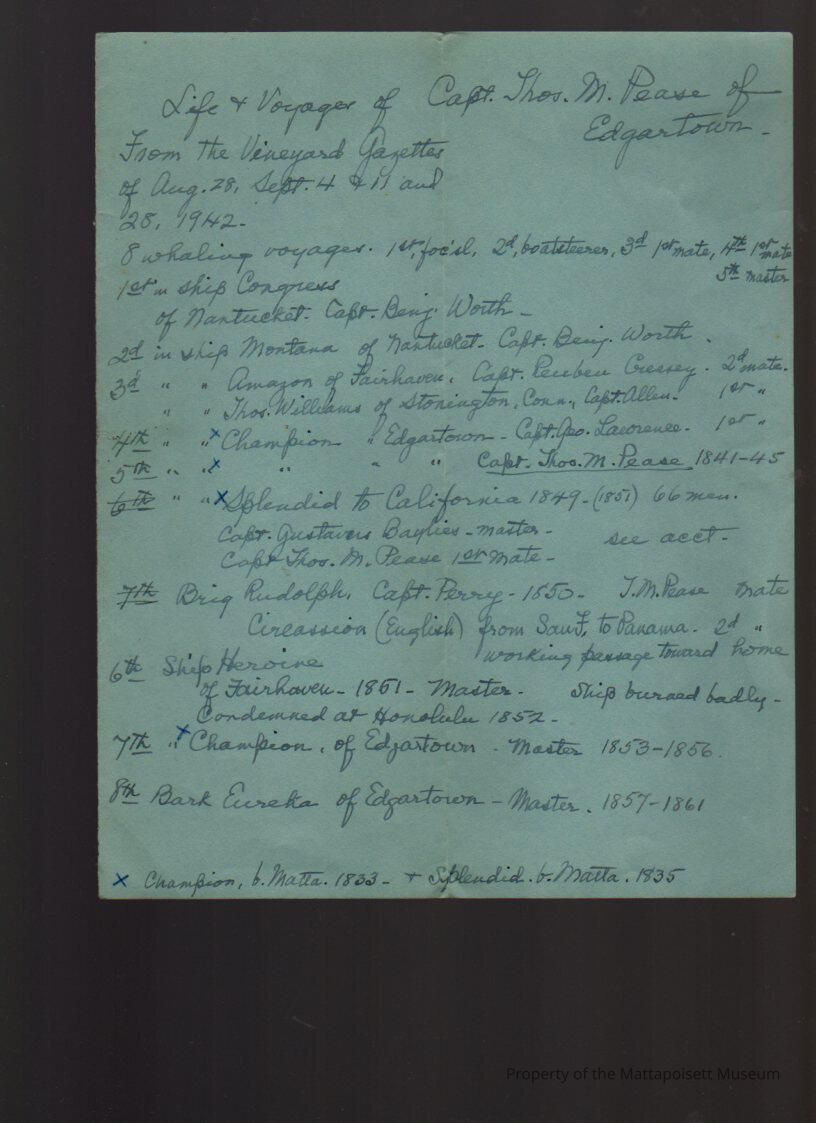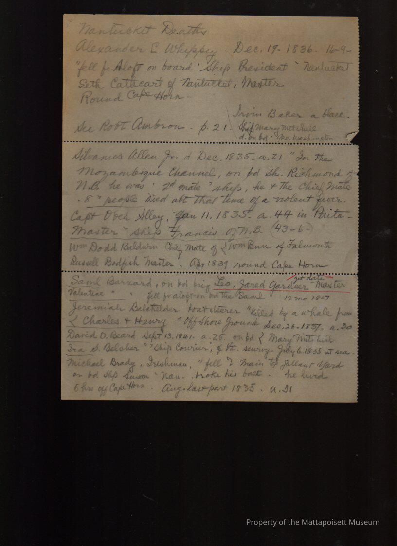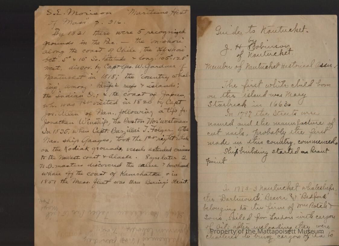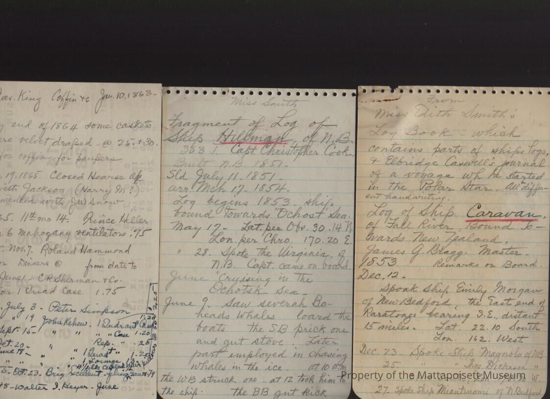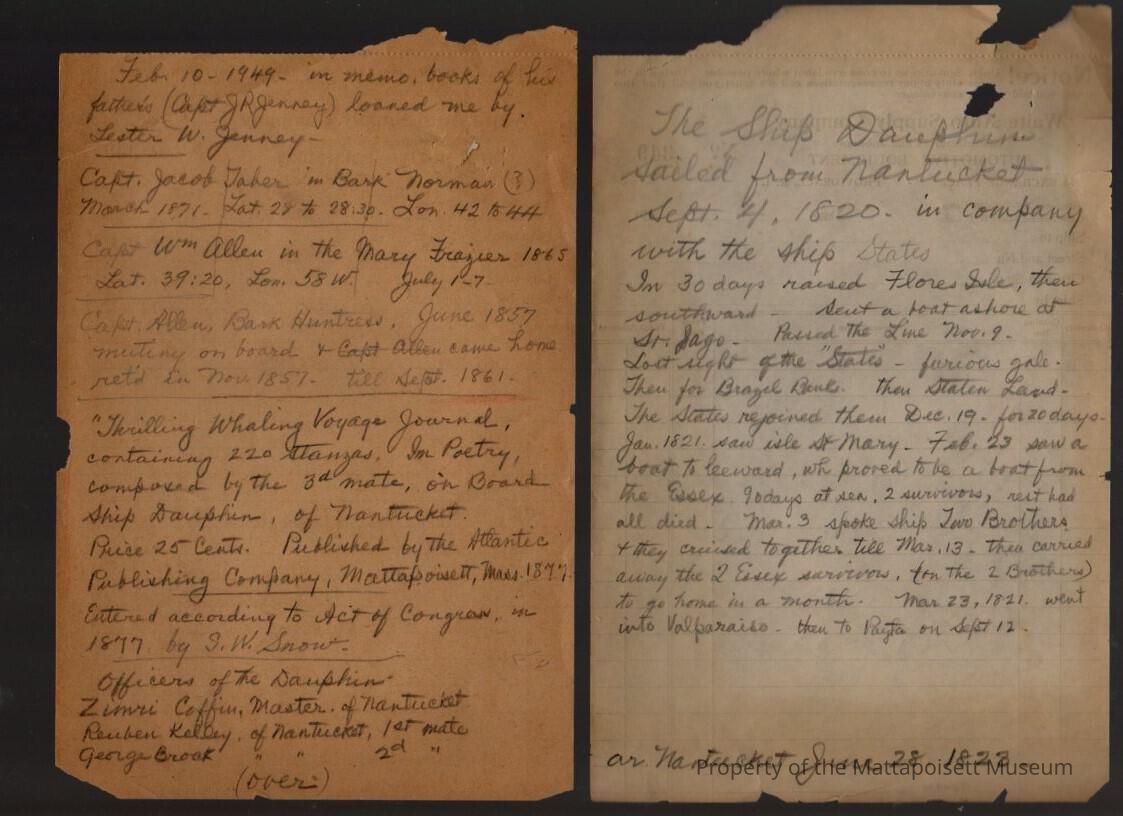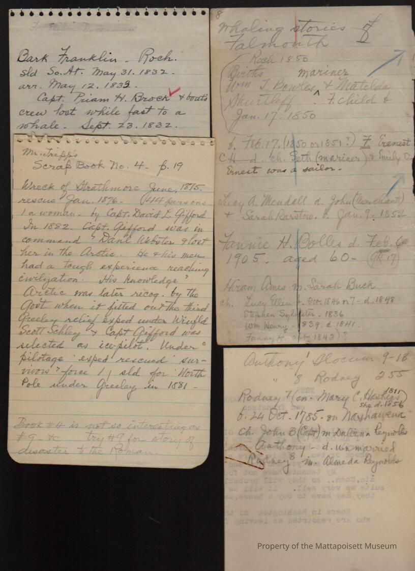 Handwritten notes, scraps of paper, excerpts, lists, copies, quotes, clippings pertaining to whaling, whaleships and persons associated with same.Collection