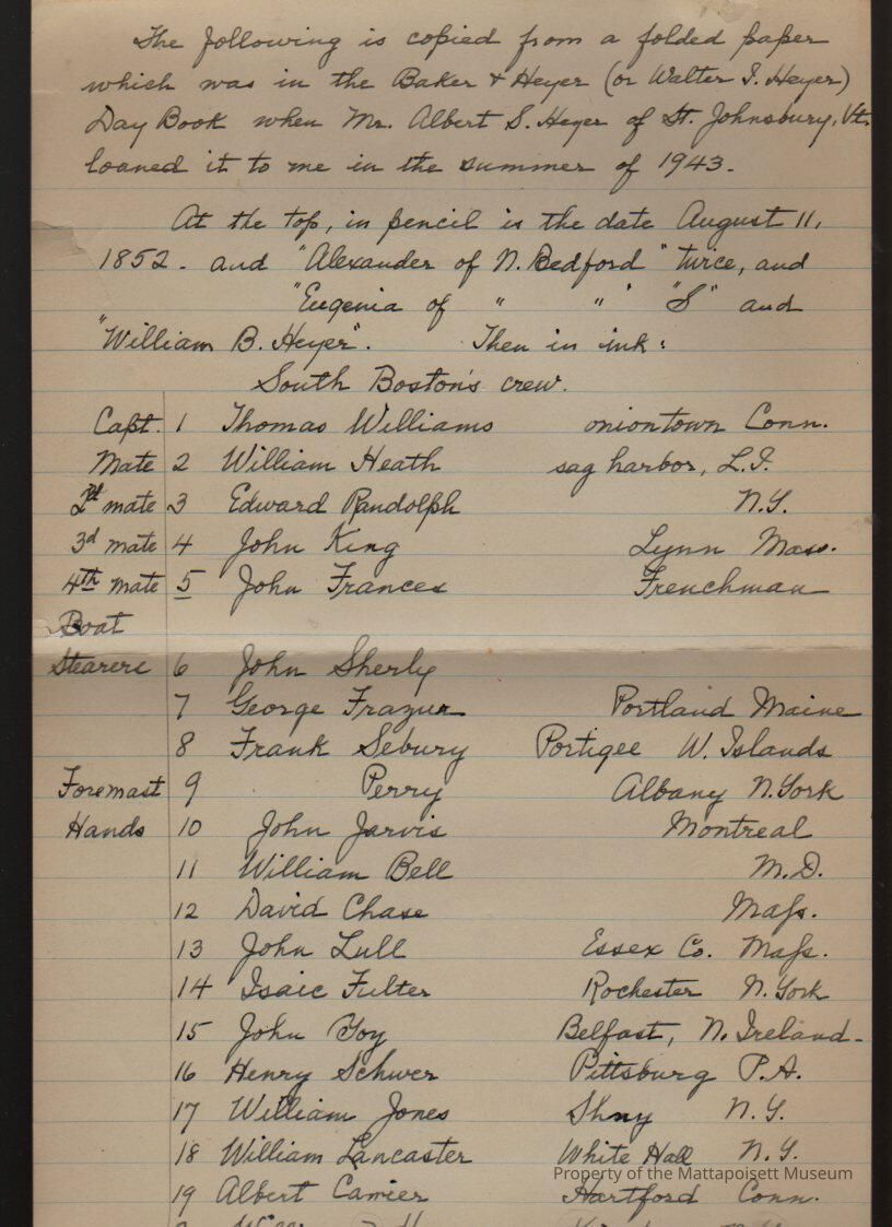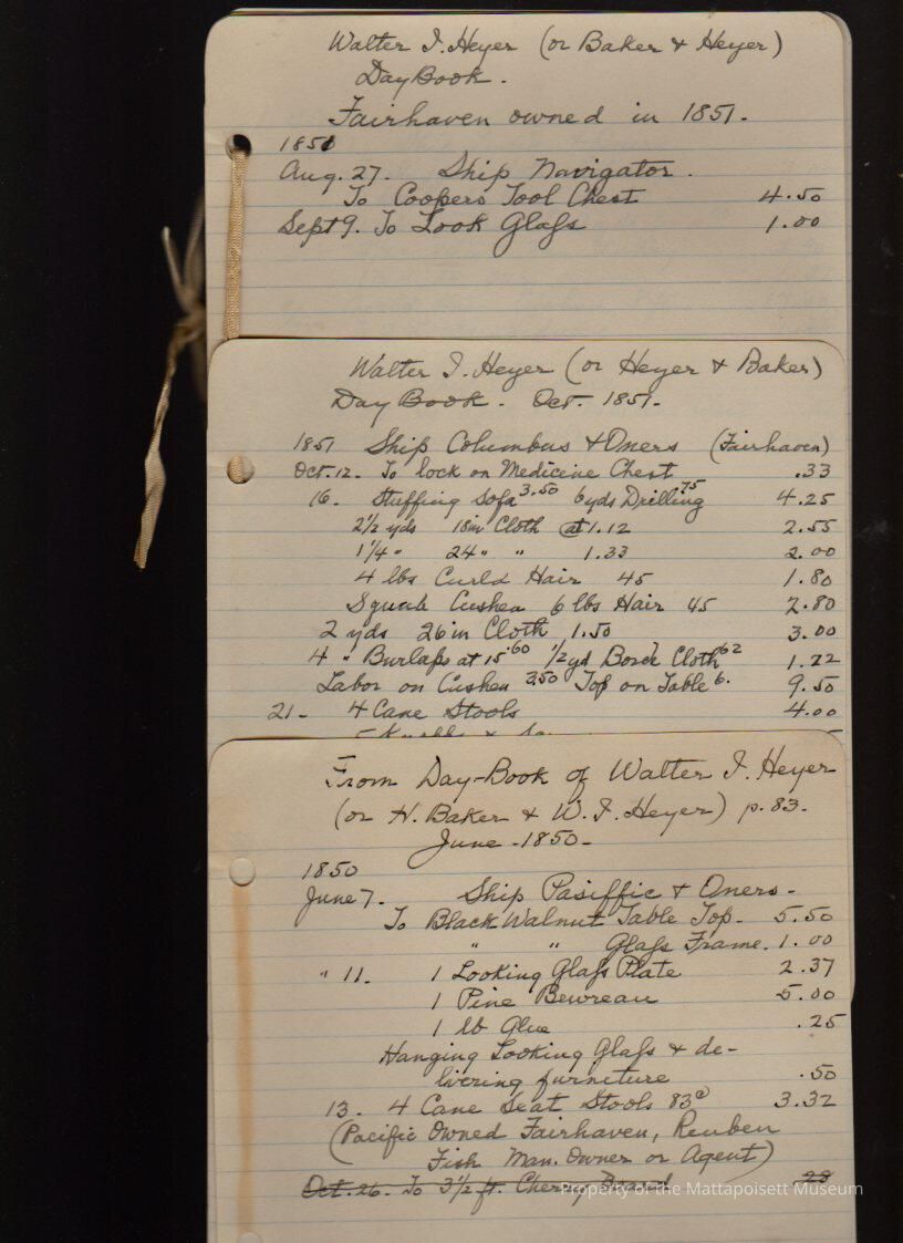 Handwritten notes, excerpts from Walter I. Heyer (Heyer & Baker) day book/log, 1850-1851.Collection