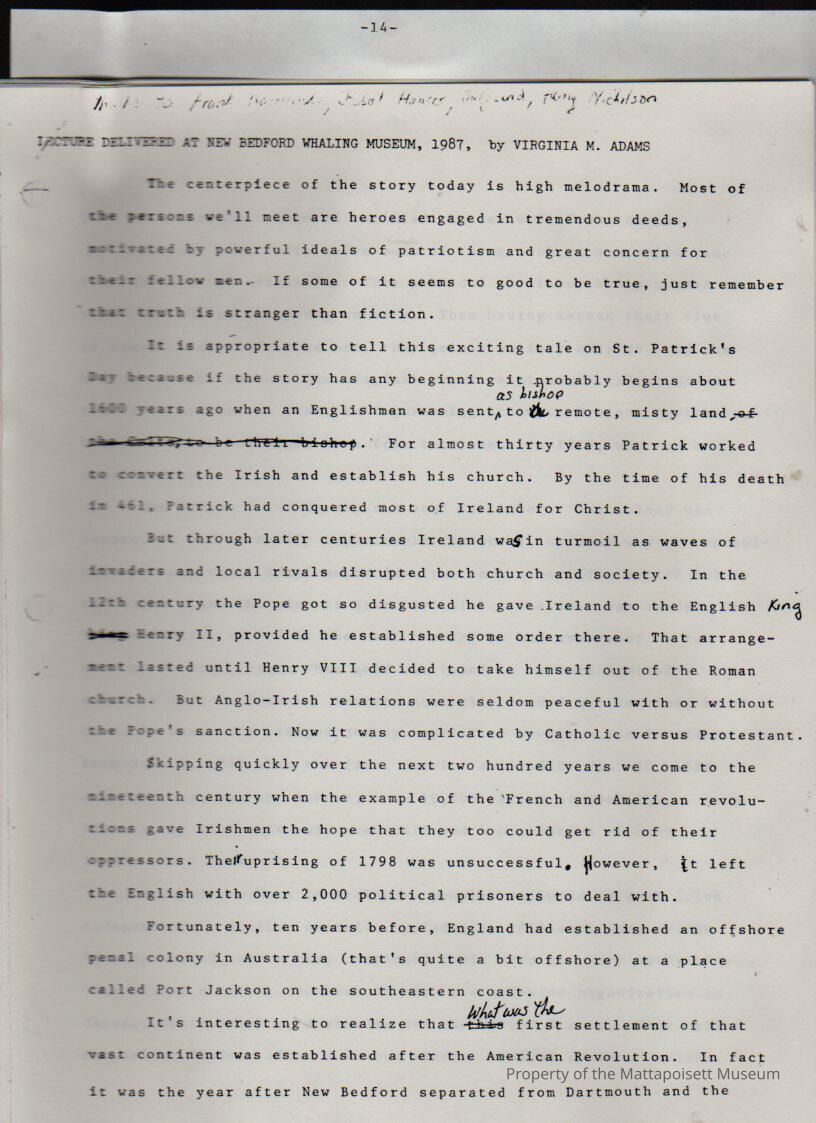 Transcription of lecture delivered at the New Bedford Whaling Museum, 1987 by Virginia M. Adams.Collection