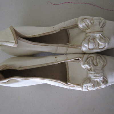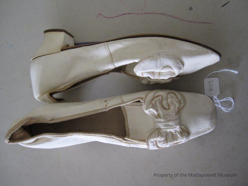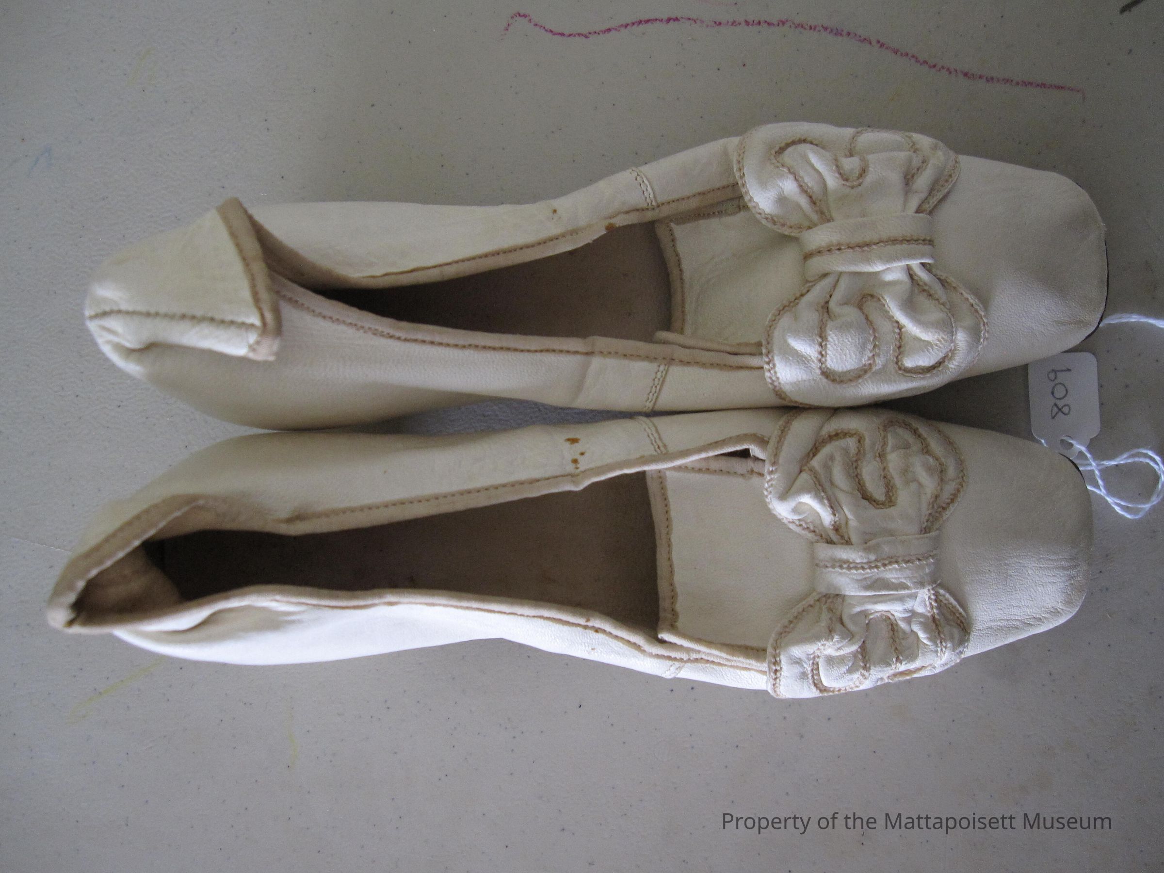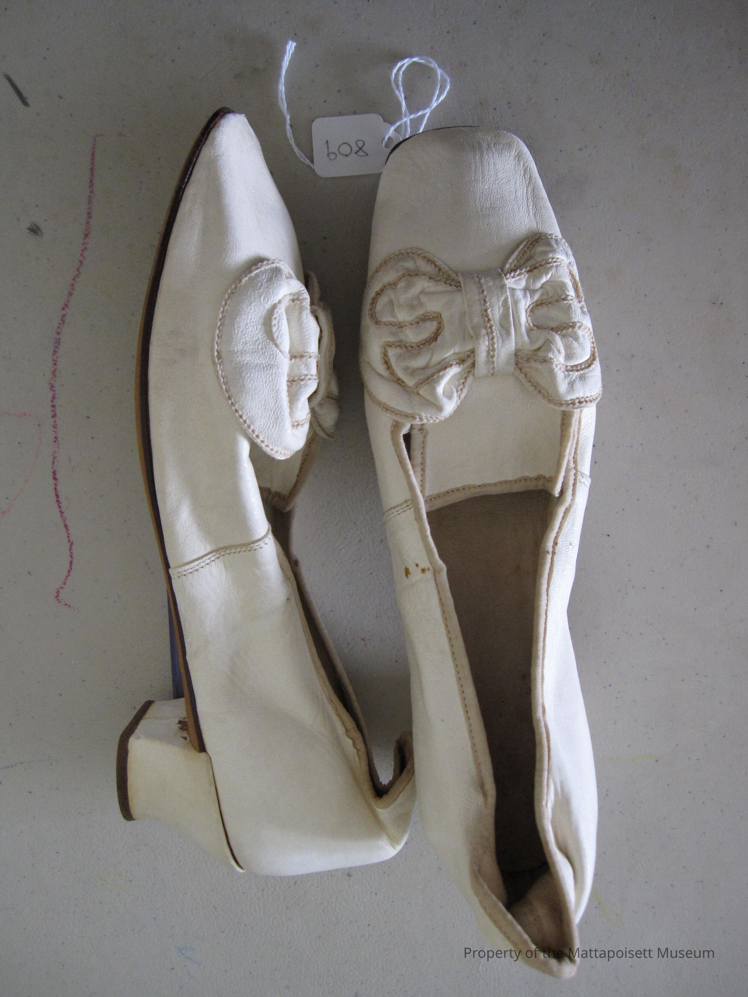 Notes: Notecard: Ladies white kid shoes. Bow trim.
