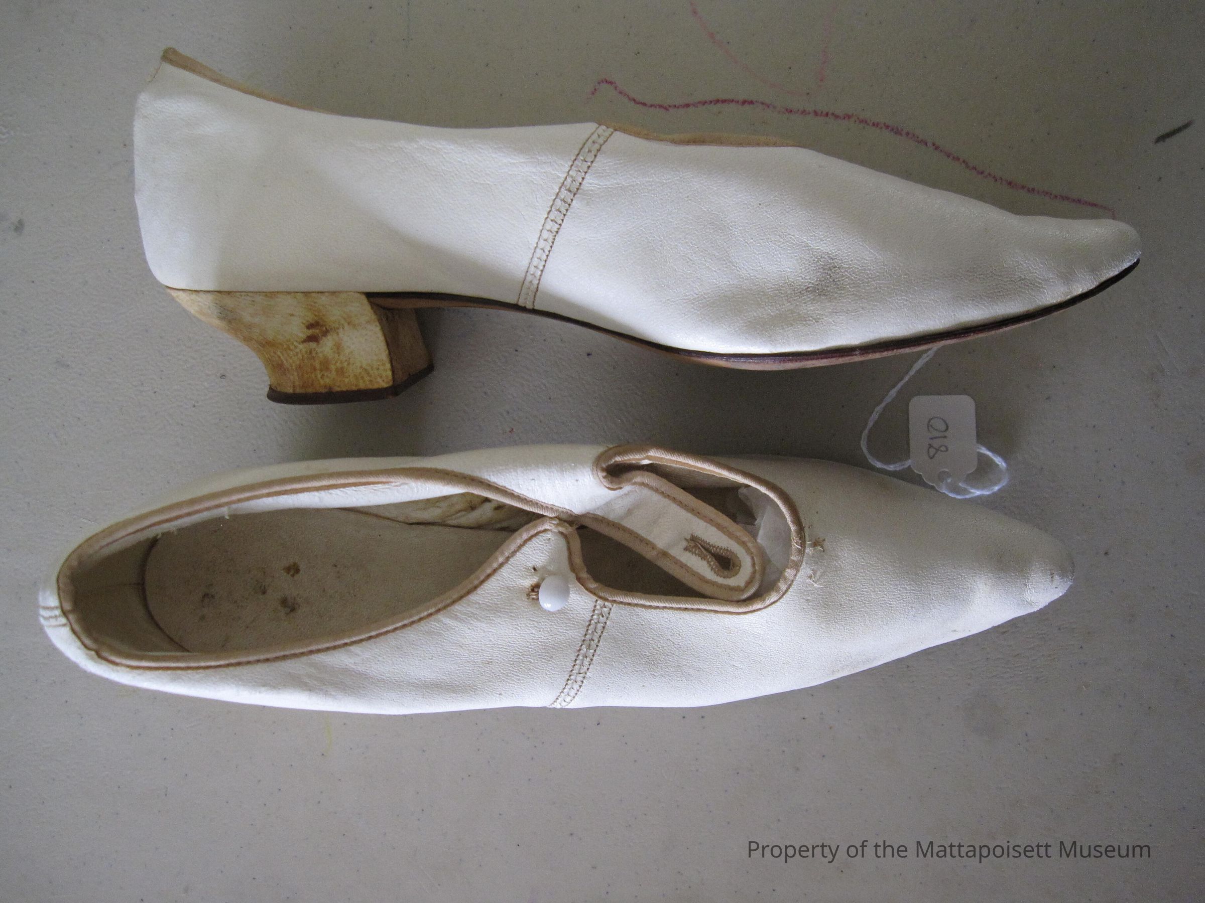 Notes: Notecard: Ladies' off-white slippers/shoesMissing trim on one, missing botton on one.