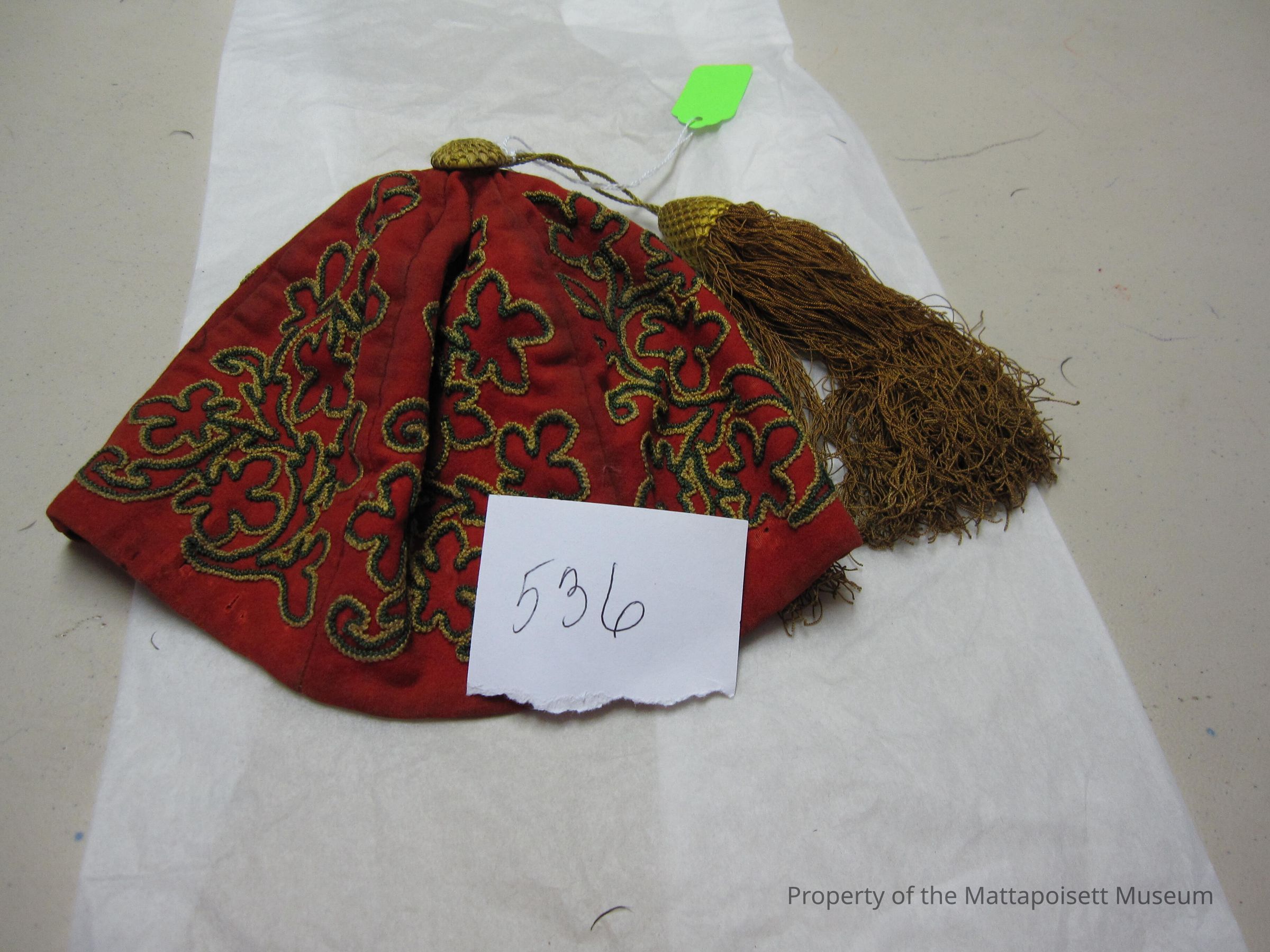 Red fez type hat with gold tassel. Green and gold floral design on hat.Collection