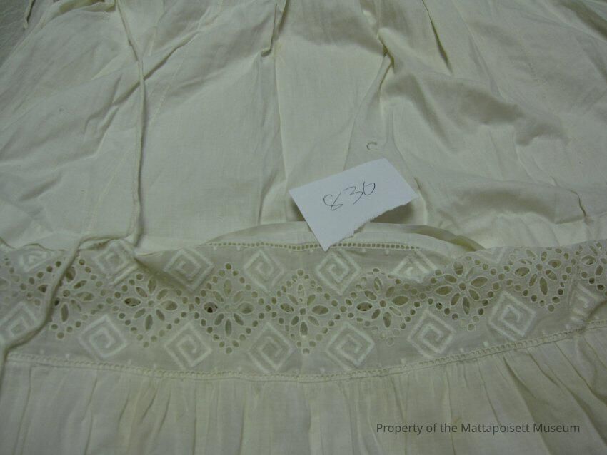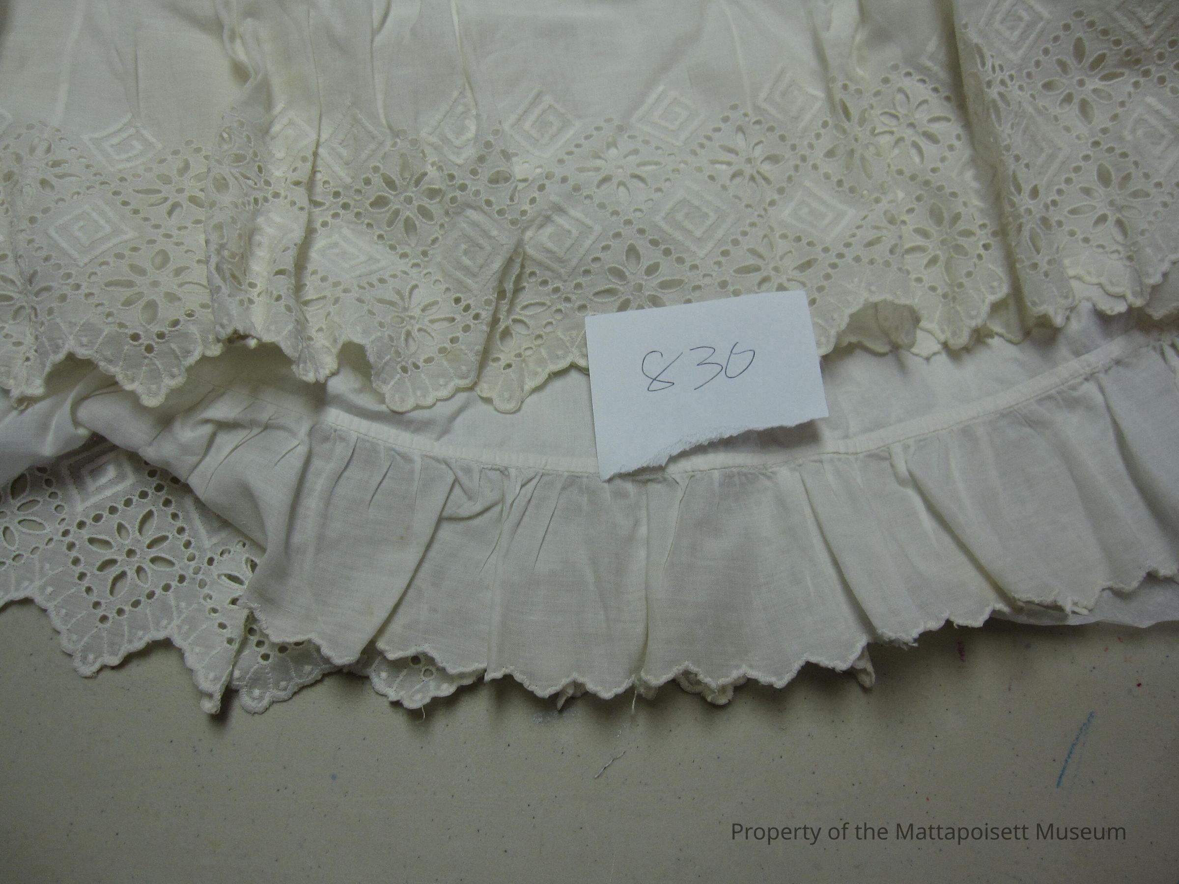 Long white petticoat. Embroidery and eyelet inset 3/4 way down and again at hem. Drawstring.Collection